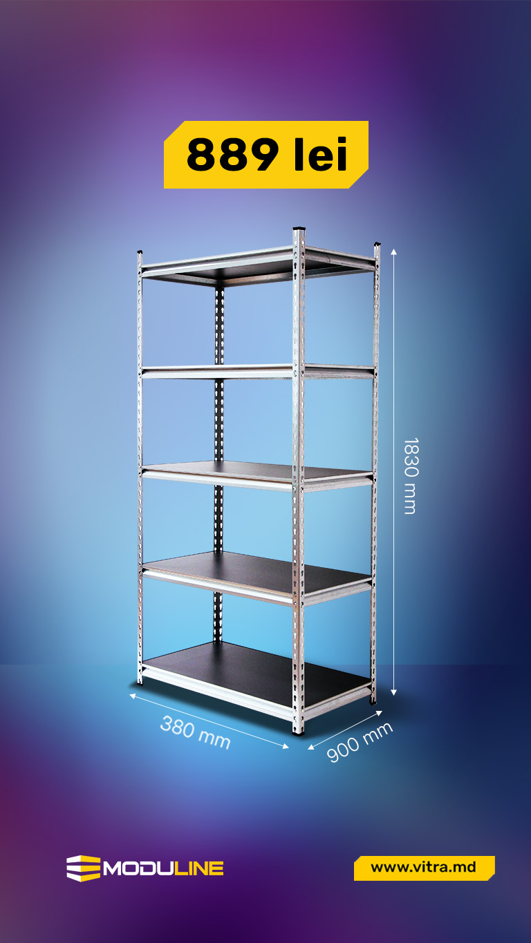 Rafturi metalice galvanizate cu dimensiunile de 900 × 380 × 1830 mm și 5 polițe din pal laminat care susțin până la 300 kg.