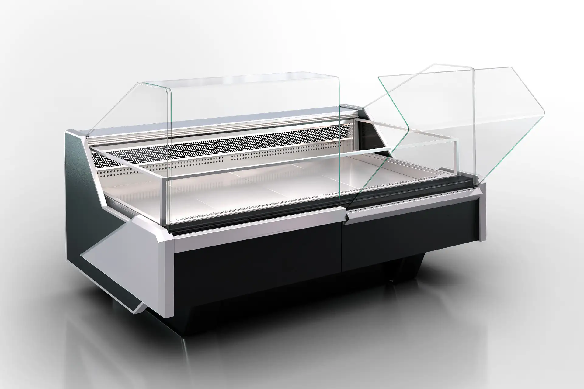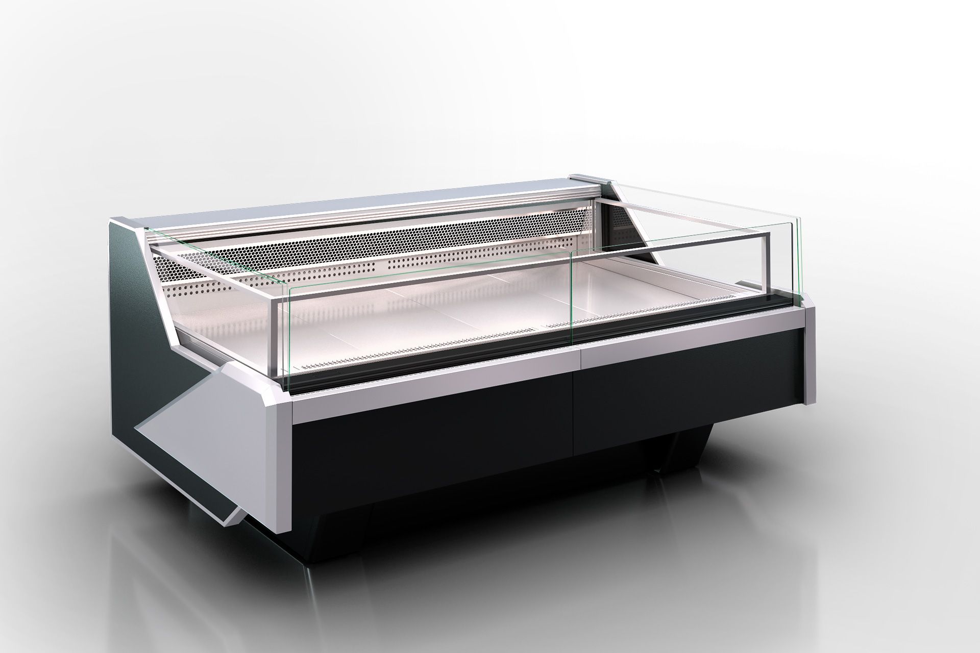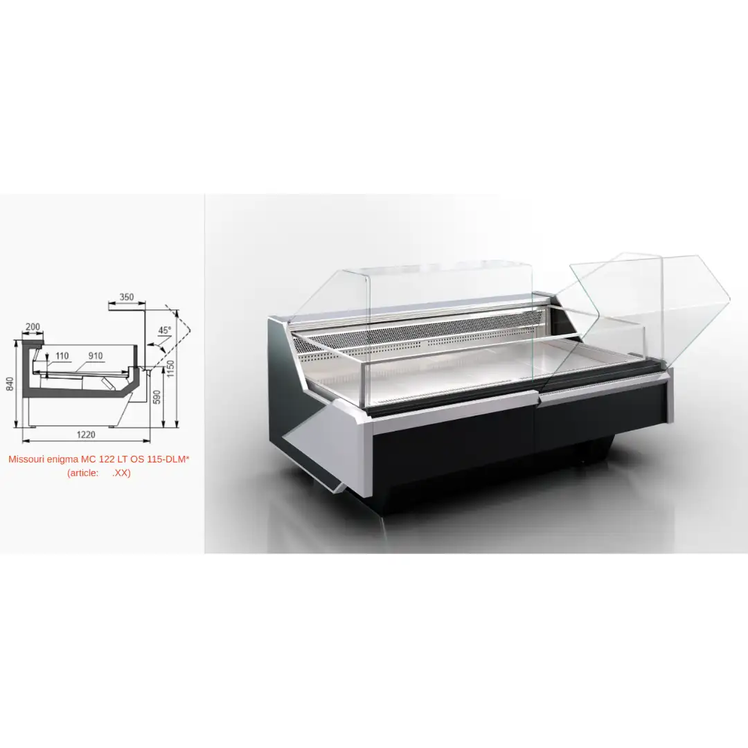 Refrigerated display case for frozen products at low temperature.