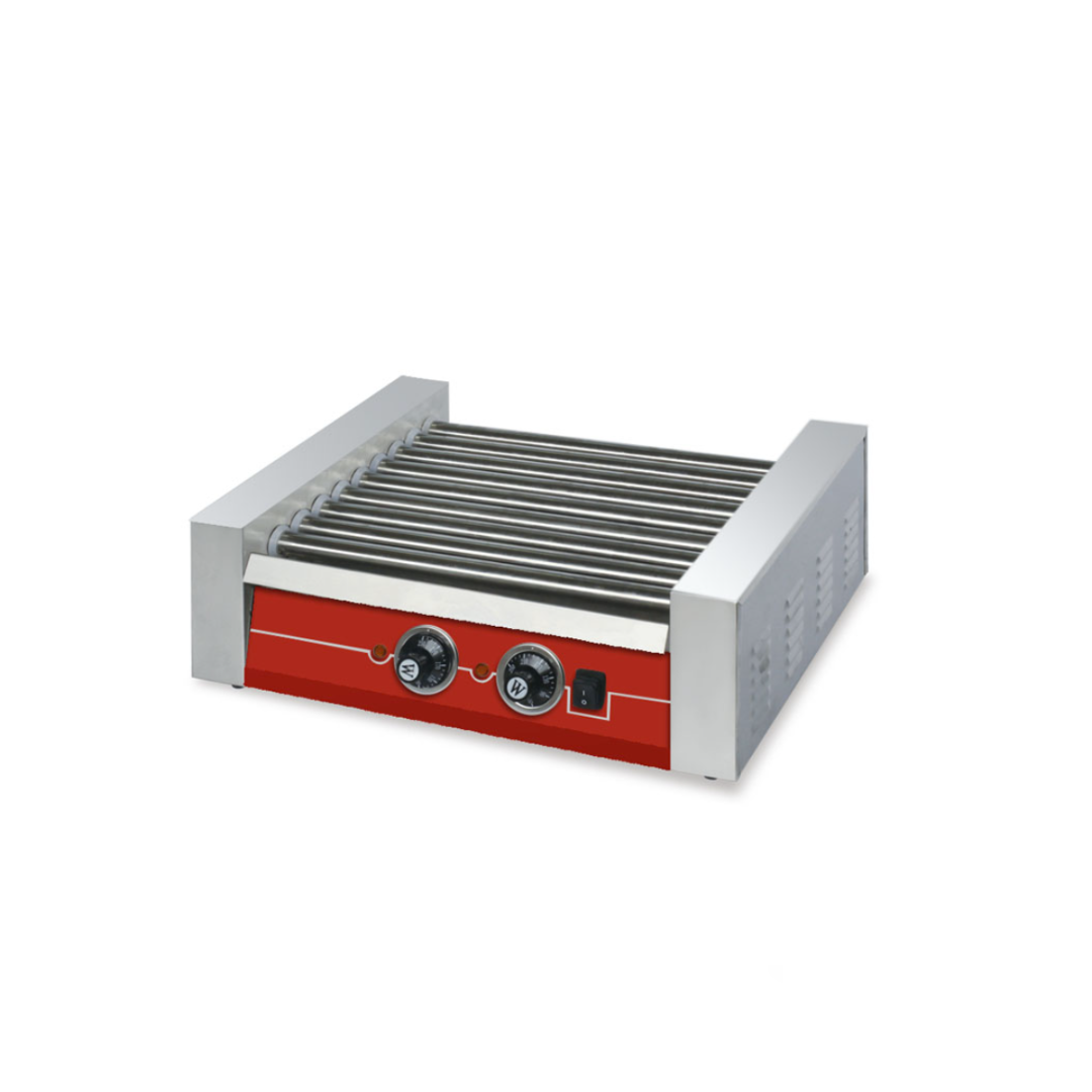 Aparat profesional de hot dog cu 7 role din inox, încălzire uniformă, control automat al temperaturii.