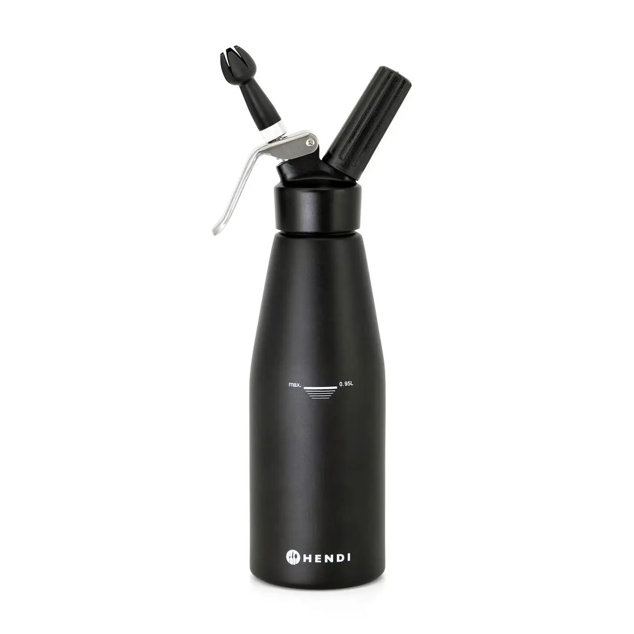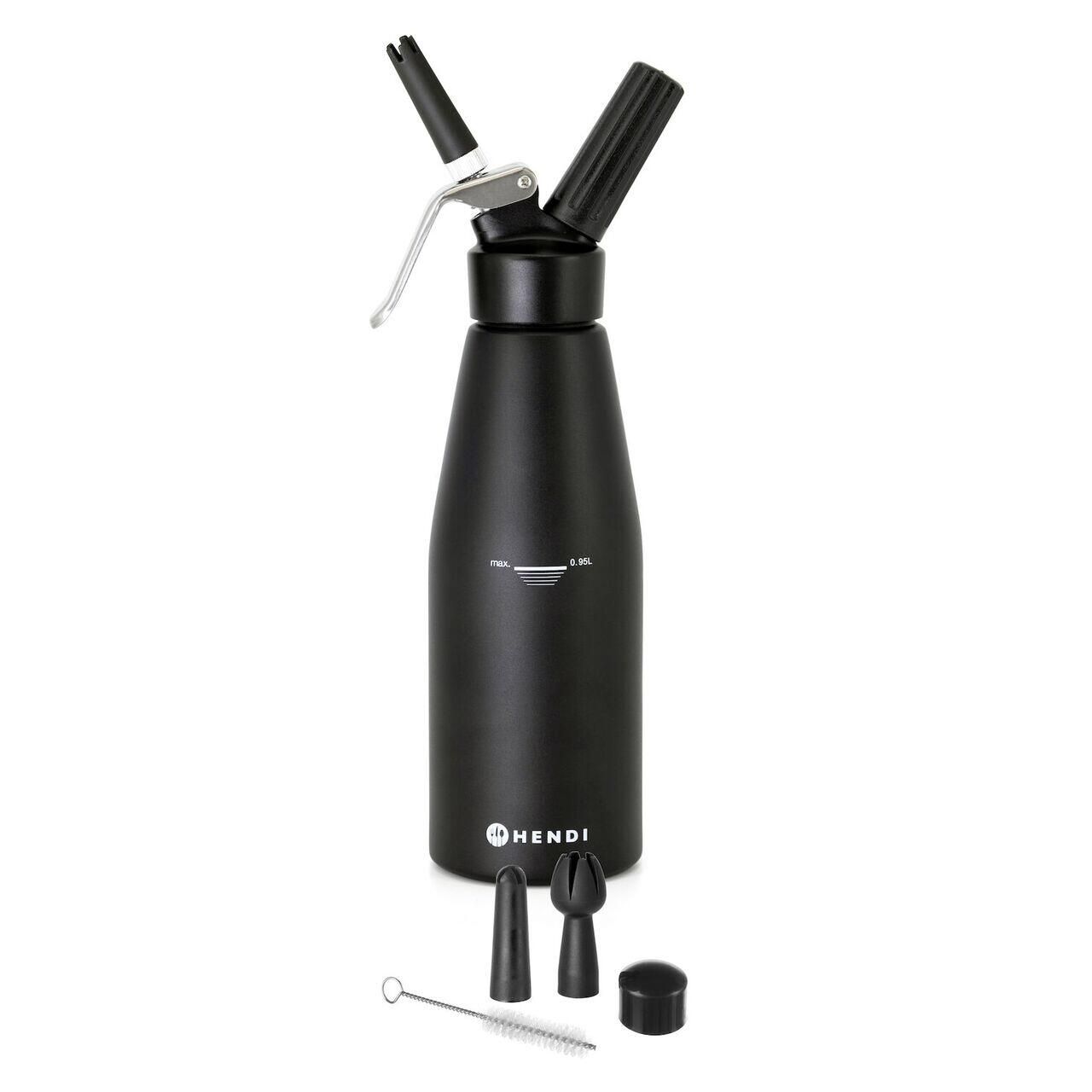 Aparatul pentru frișcă Hendi Kitchen Line are o capacitate de 0,5 litri și include 3 duze și o perie de curățare. De culoare neagră, acesta are dimensiunea de 80x260 mm.