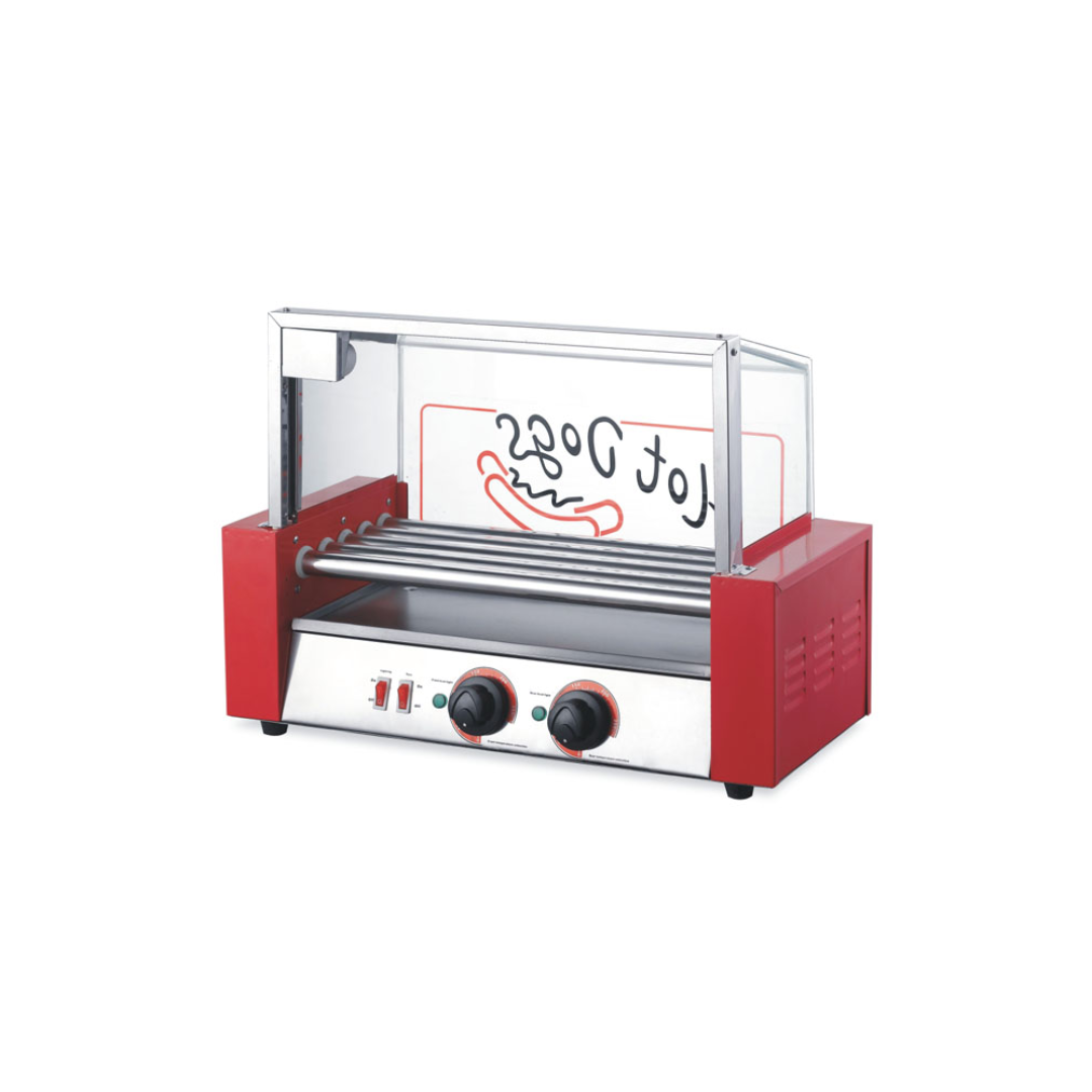 Aparat profesional pentru hot dog cu 5 role, temperatură reglabilă până la 250 °C, alimentare electrică.