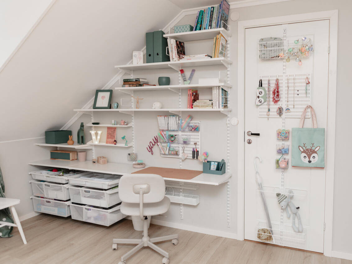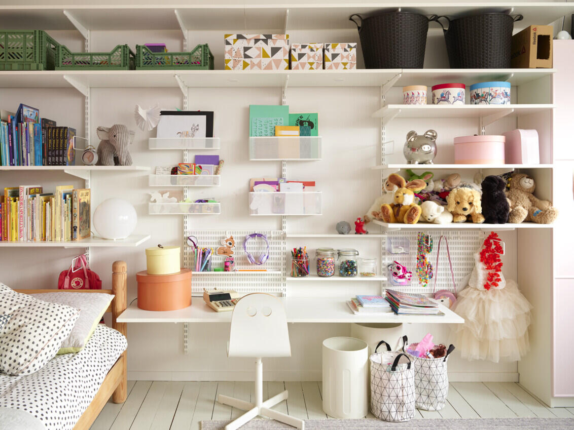 Soluția modulară Elfa pentru camera copiilor îmbină rafturi reglabile, organizatoare și sertare într-un sistem aerisit, montat pe perete. Configurațiile se ajustează pe înălțime și lățime și se rearanjează pe măsură ce copilul crește, astfel încât fiecare colț devine util: birou, lectură, hobby. Panourile perforate, tăvile, cutiile și barele țin la vedere cărți, rechizite și jucării, iar materialele durabile cu finisaje neutre se integrează ușor. Montanții și consolele asigură stabilitate, eliberează podeaua și simplifică întreținerea.