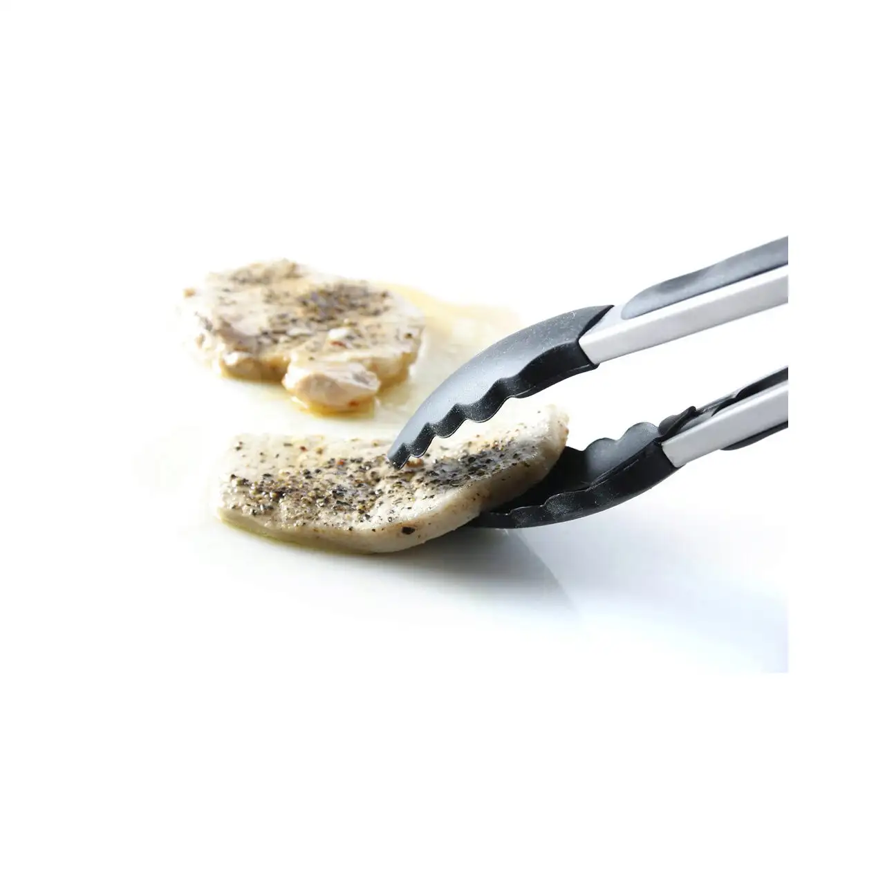 Clește pentru servire din oțel inoxidabil cu vârfuri din silicon rezistent la temperaturi ridicate, disponibil în lungimi de 240, 300 și 400 mm.