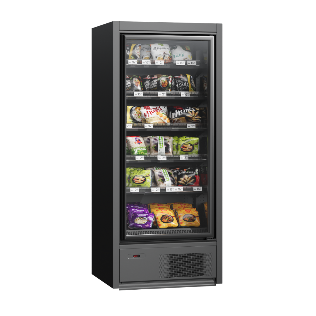 Congelator vertical cu temperatură scăzută și sistem de răcire la distanță. Echipamentul include controler de temperatură, ventilatoare eficiente energetic EC, supapă de expansiune, iluminare superioară LED și rafturi reglabile pe înălțime cu suporturi pentru etichete de preț. Ideal pentru afaceri.