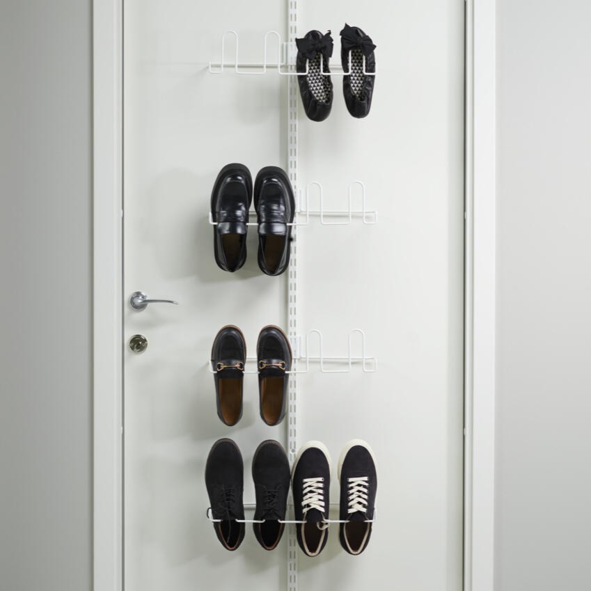 Sistemul de depozitare Elfa pentru încălțăminte, montat direct pe ușă, oferă organizare clară și acces rapid. Suporturile metalice fixează ferm fiecare pereche și le mențin departe de podea, protejând suprafețele și facilitând curățenia. Structura modulară se adaptează ușor la diferite tipuri de pantofi, fiind ideală pentru holuri, dressinguri sau camere cu spațiu limitat.
