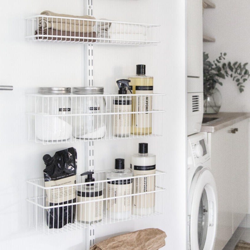 Sistemul de depozitare Elfa pentru produse de curățenie și spălat se montează ușor și fără găuri pe ușă. Organizatoarele metalice sunt ajustabile și oferă vizibilitate și acces rapid la produse, maximizând spațiul vertical. Soluția versatilă adaugă funcționalitate și ordine în băi, cămări sau zone de spălătorie.