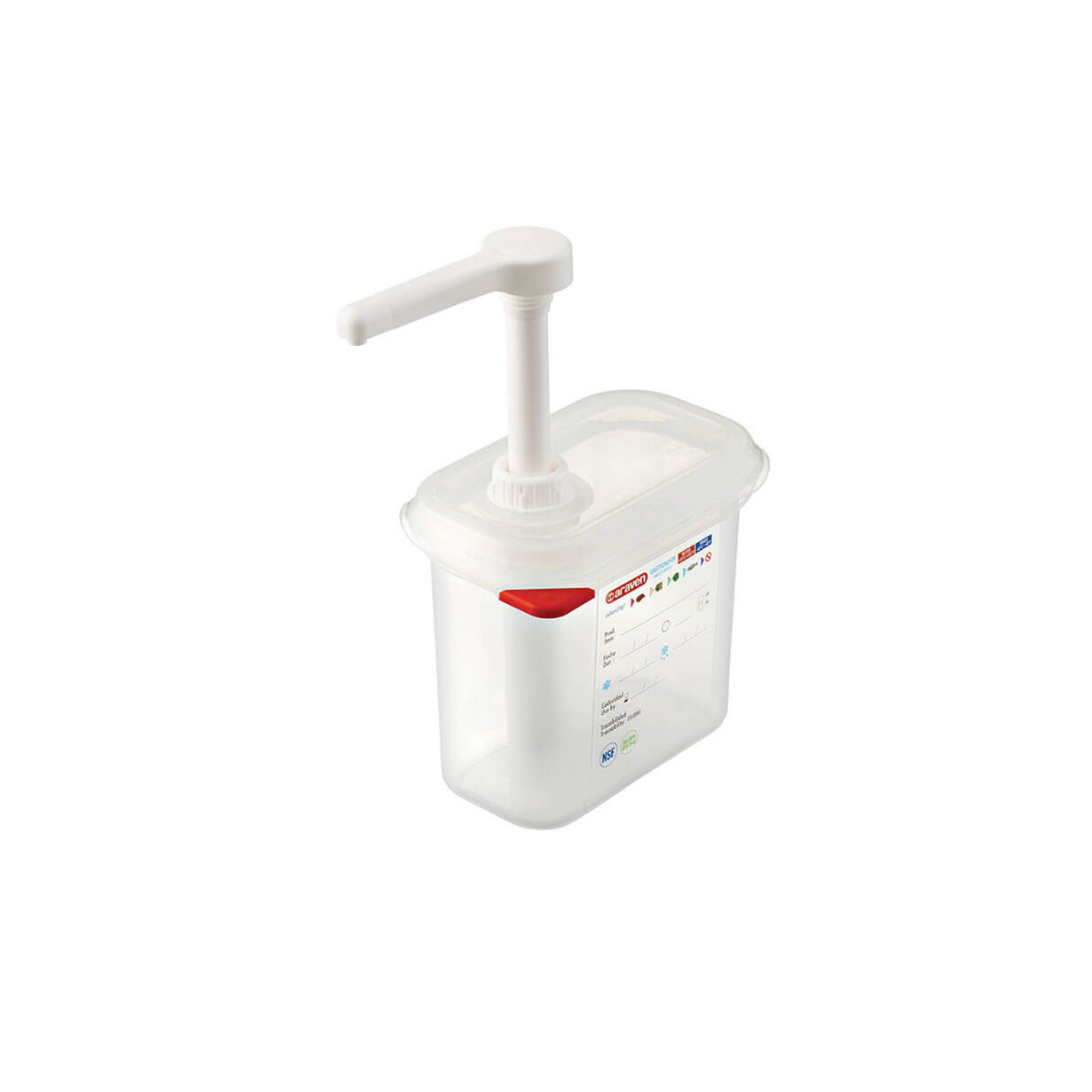 Dozator GN pentru sos cu pompă, compatibil cu recipiente gastronorm, permite dozarea precisă și igienică a sosurilor, fiind realizat din materiale rezistente pentru utilizare profesională în bucătării și unități HoReCa.