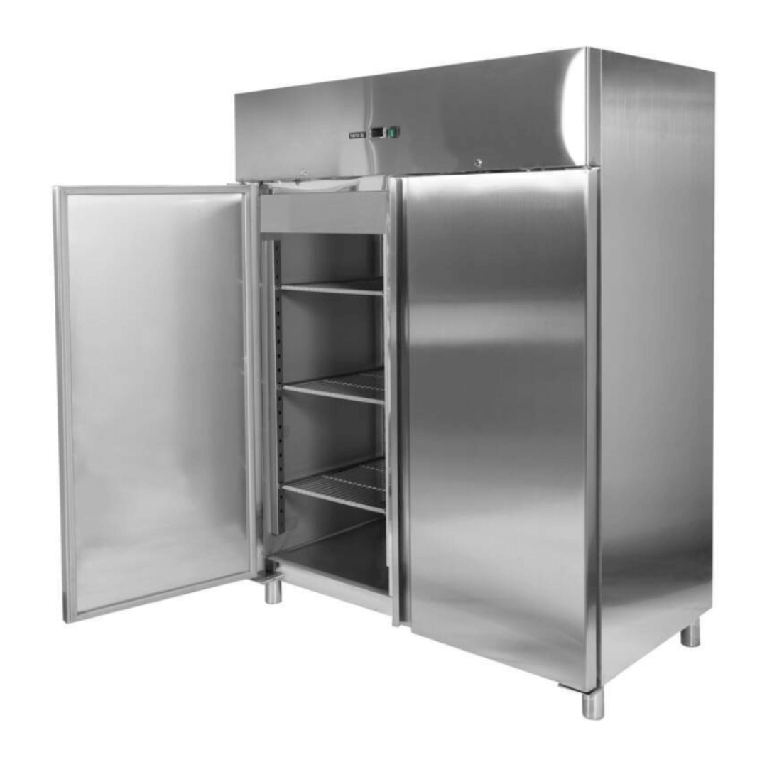 Dulap frigorific cu două uși, esențial pentru păstrarea alimentelor perisabile în restaurante, magazine și baruri. Carcasa rezistentă din inox oferă durabilitate și ușurință în curățare, garantând igienă maximă. Iluminatul LED intern asigură vizibilitate optimă, iar display-ul digital permite control precis al temperaturii. Unitatea de control avansată, împreună cu termostatul și sistemul de reglare automată, mențin prospețimea constantă. Ventilatoarele puternice și condensatorul performant sunt responsabile de răcirea eficientă. Izolarea electrică și picioarele reglabile sporesc siguranța și stabilitatea echipamentului.