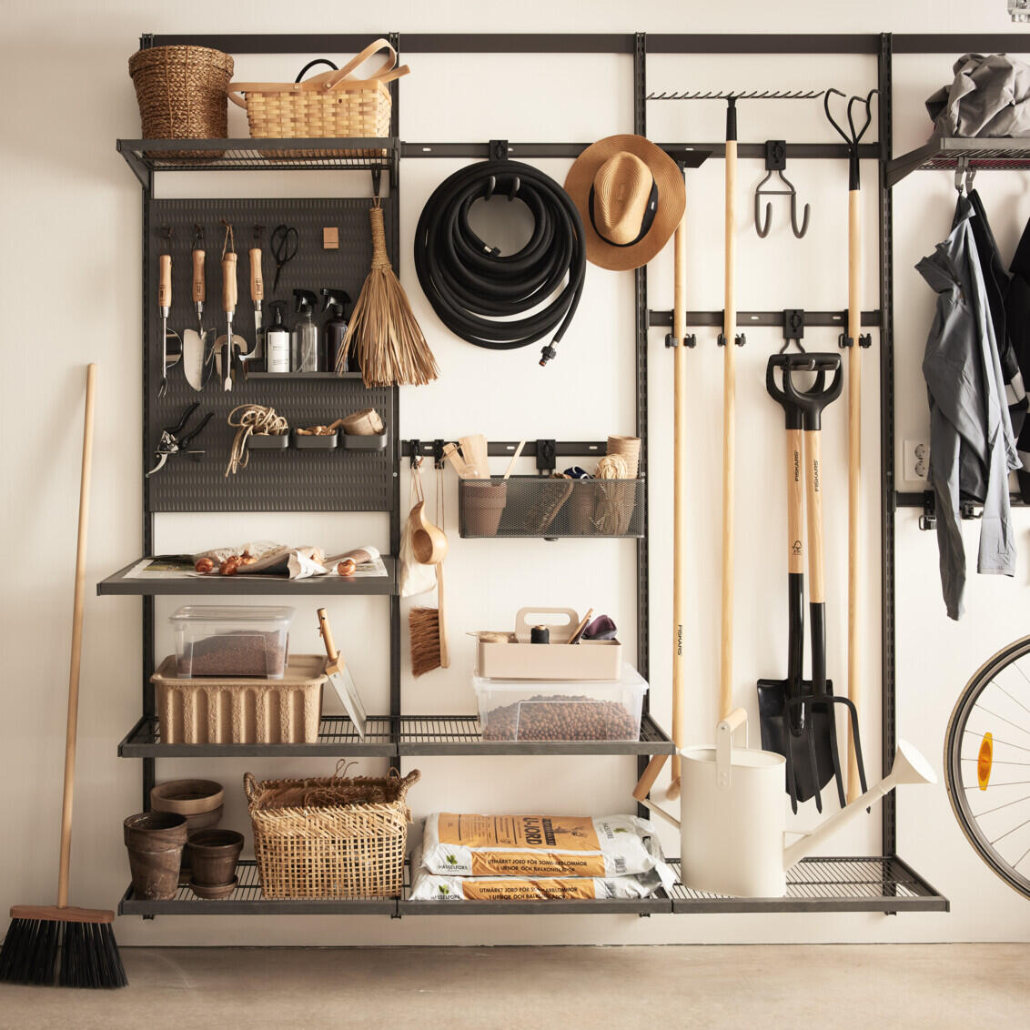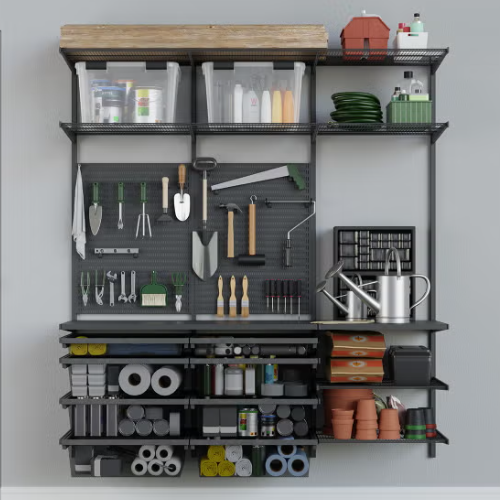 Soluție de depozitare pentru garaj cu montaj pe perete, destinată organizării eficiente a echipamentelor de grădinărit. Sistem de organizare pentru greble, perii, corpuri de iluminat, unelte mici, mingi și accesorii. Sistem modular de depozitare pentru garaj, care include șină superioară, montanți de perete, console metalice, rafturi din sârmă, coș din plasă și panou de depozitare. Montanții și consolele reglabile permit o configurare flexibilă. Sistem extensibil de depozitare pe perete pentru garaj, realizat din componente metalice durabile pentru utilizare pe termen lung.