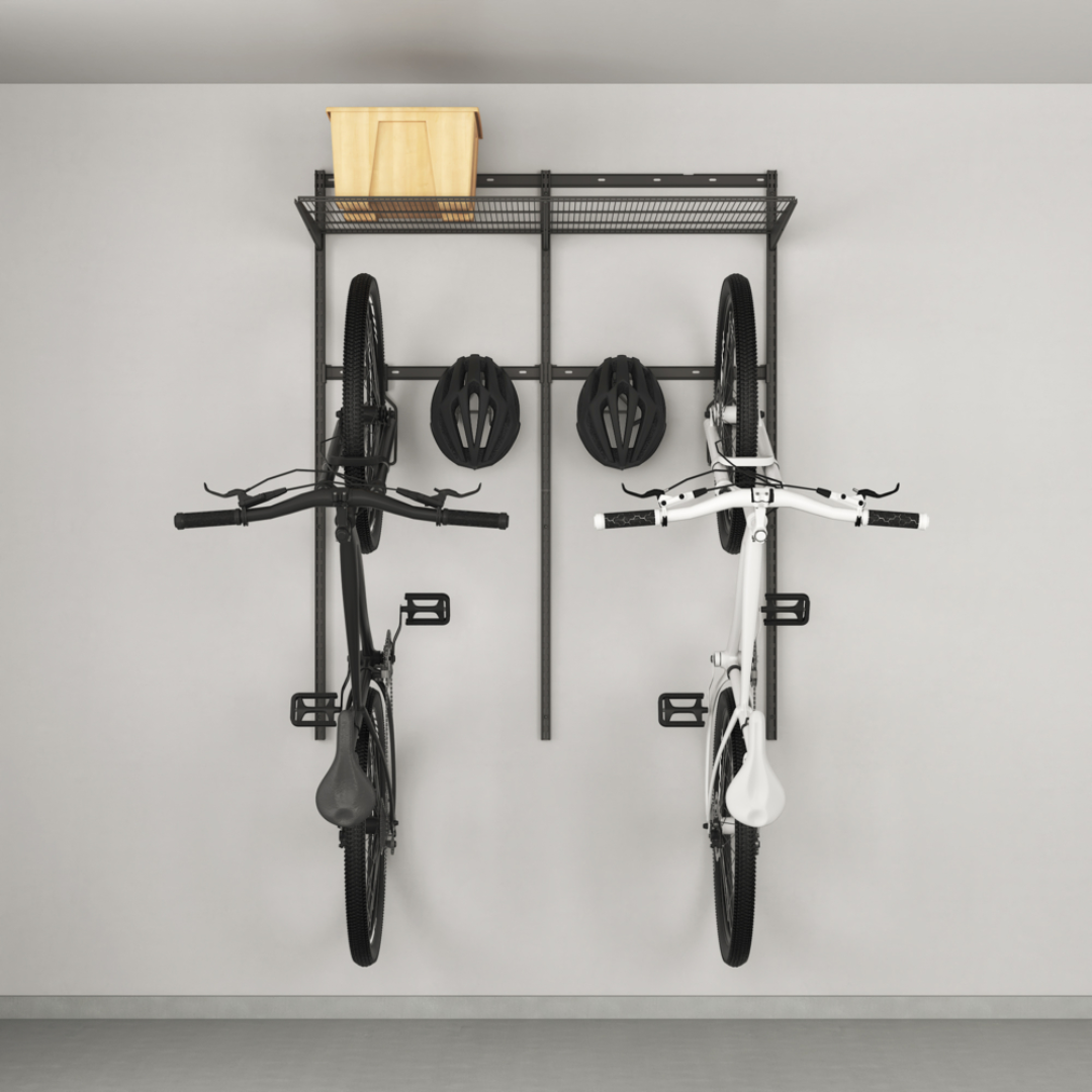 Soluție de depozitare biciclete montată pe perete pentru garaj, proiectată pentru depozitarea eficientă a bicicletelor și organizarea spațiului pe peretele garajului. Sistemul de depozitare biciclete pentru garaj utilizează spațiul vertical al peretelui pentru suspendarea bicicletelor și depozitarea organizată a căștilor de bicicletă și a accesoriilor pentru ciclism. Sistemul modular de depozitare biciclete pe perete include șină superioară, montanți verticali, console de fixare, rafturi metalice din sârmă și cârlige pentru biciclete. Suportul metalic de biciclete montat pe perete asigură suspendarea sigură a bicicletelor și depozitarea durabilă a căștilor și accesoriilor. Sistemul reglabil de depozitare pe perete pentru garaj permite poziționarea flexibilă a bicicletelor, căștilor și accesoriilor.