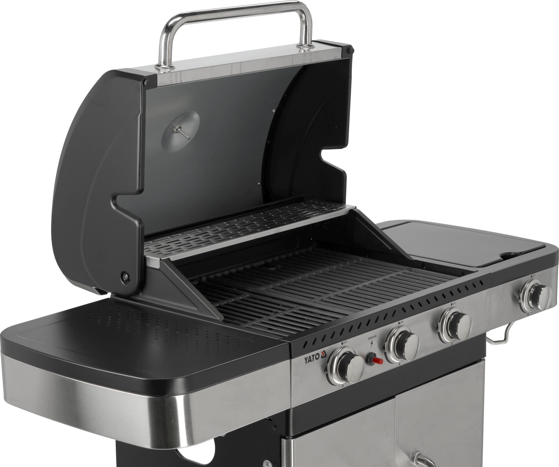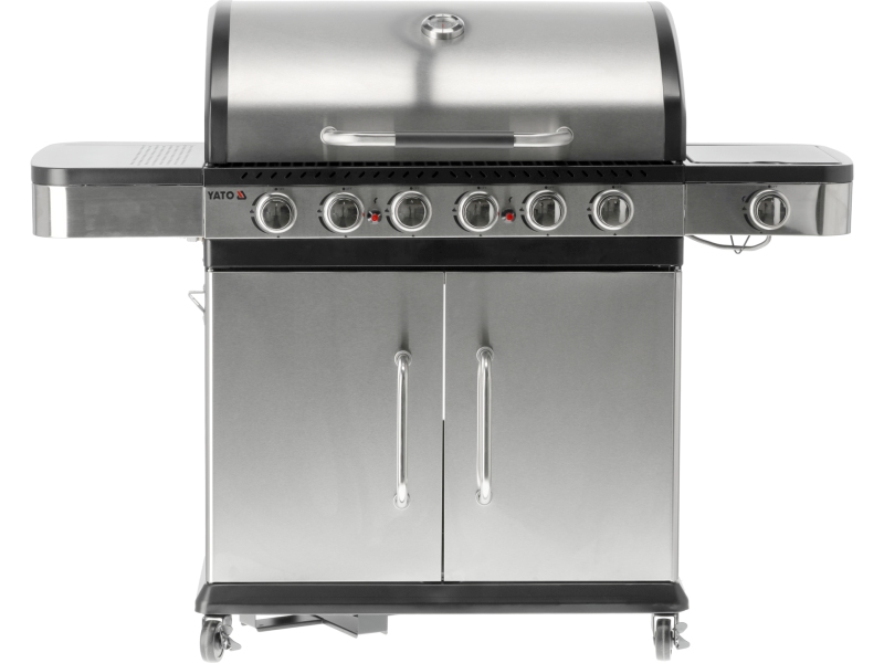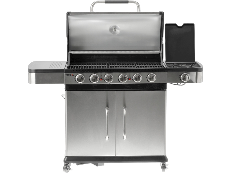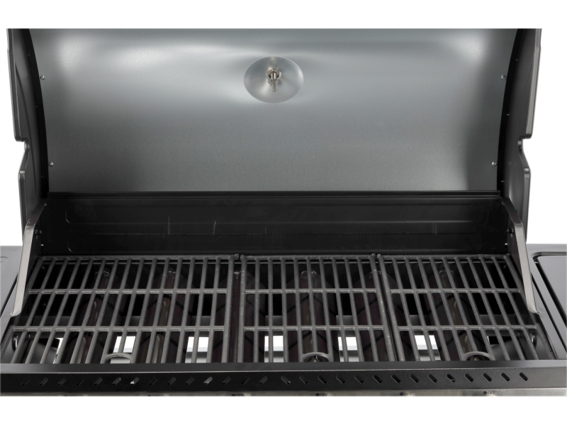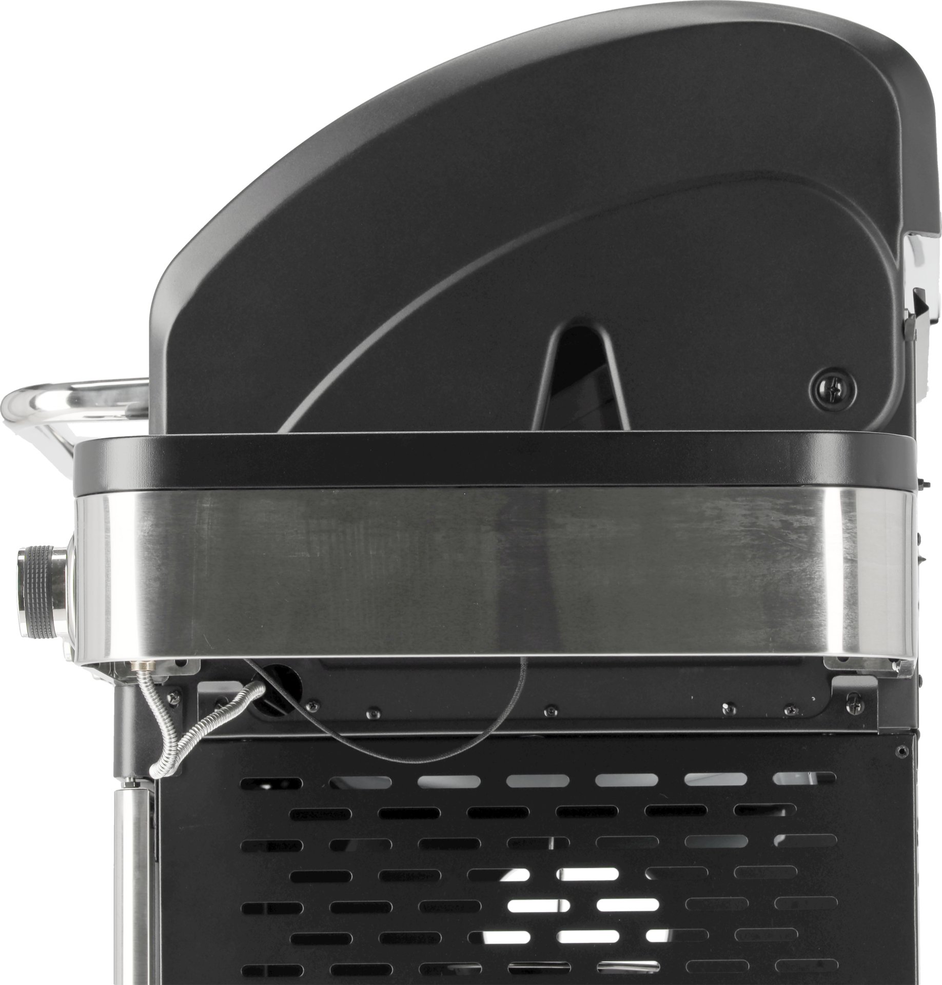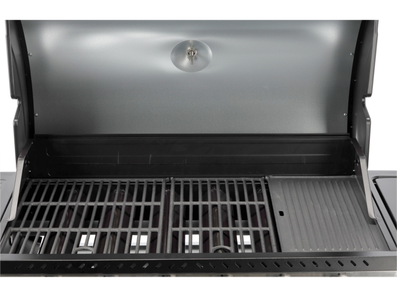 Grătar pe gaz portabil cu cinci arzătoare, suprafață de gătire din fontă și capac cu termometru, destinat utilizării în aer liber.