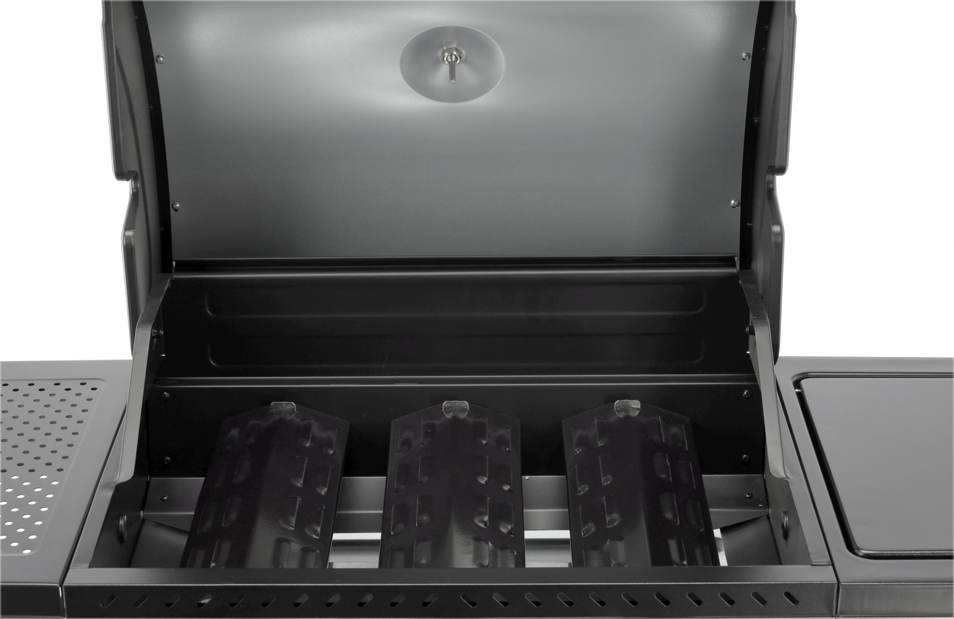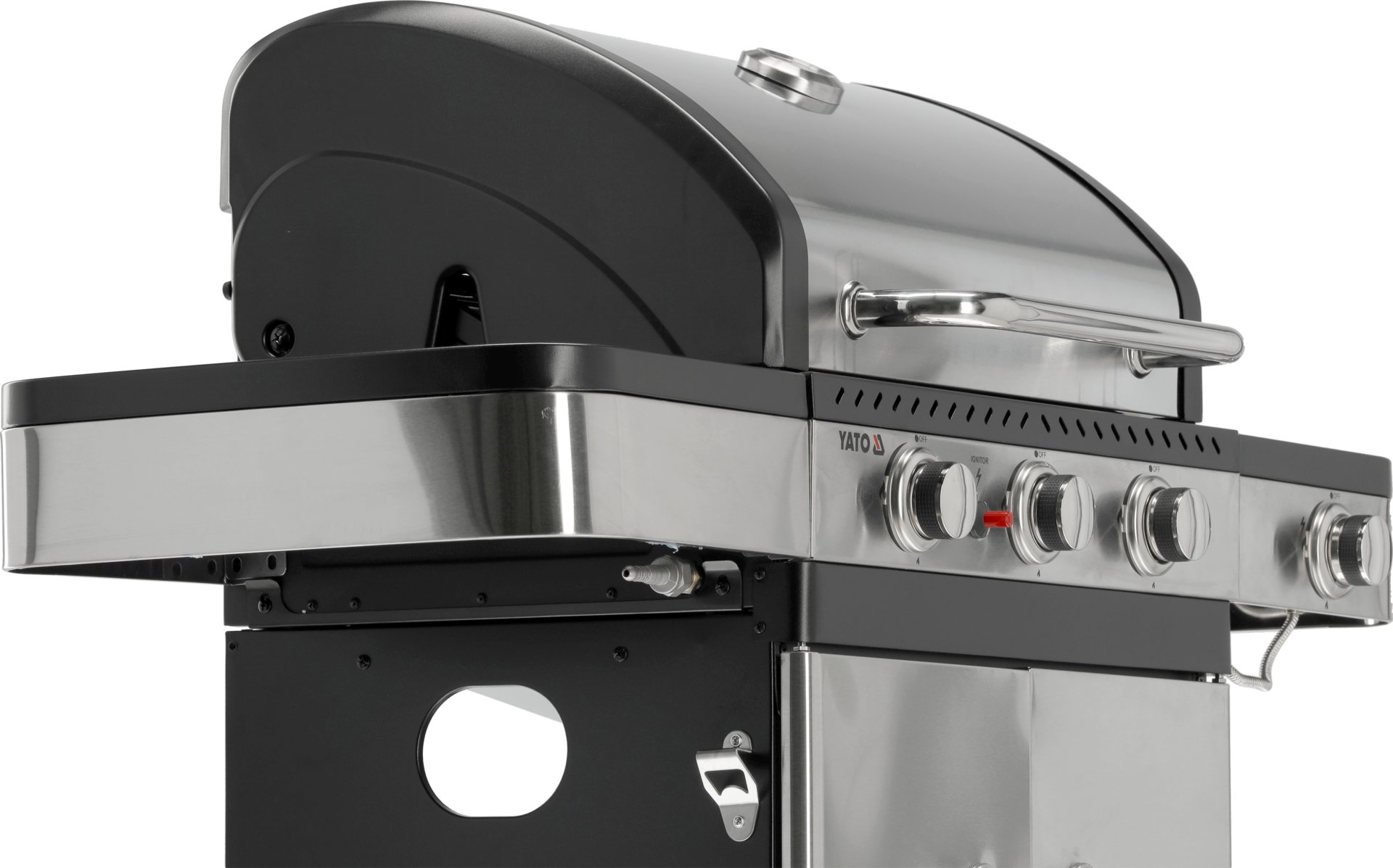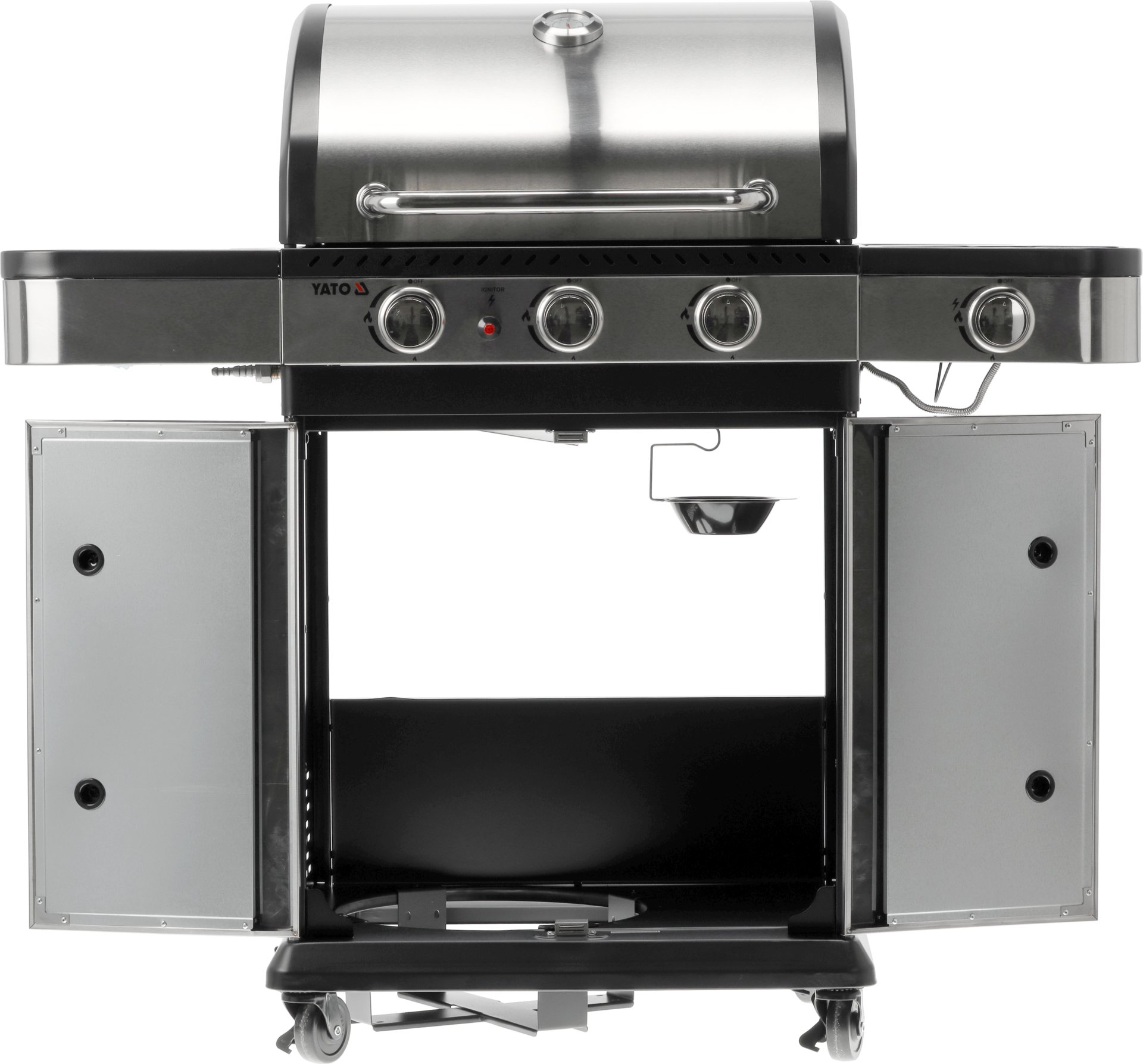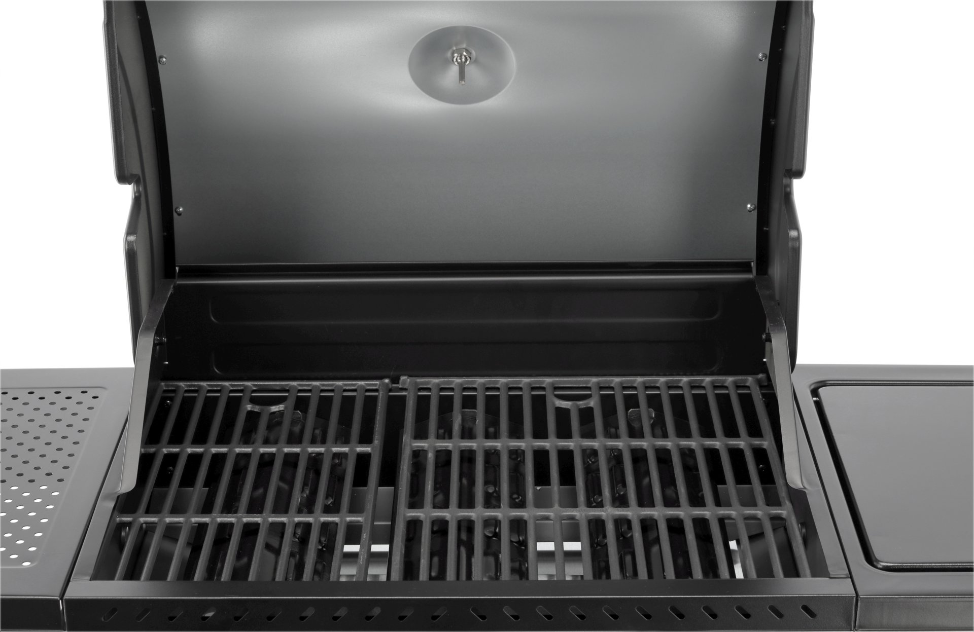 Grătar pe gaz portabil cu cinci arzătoare, suprafață de gătire din fontă și capac cu termometru, destinat utilizării în aer liber.