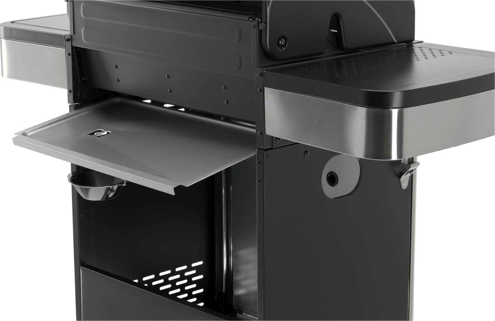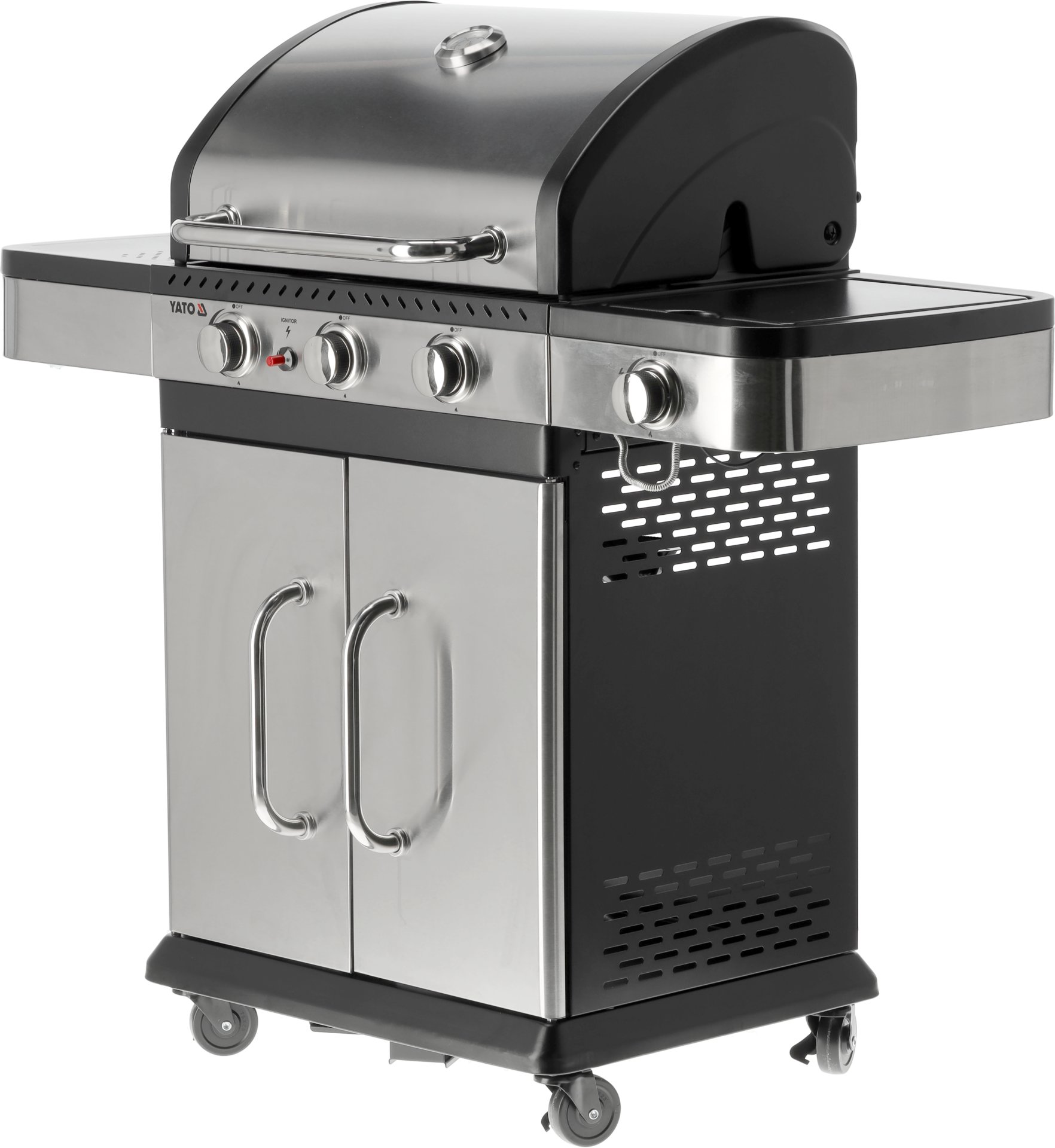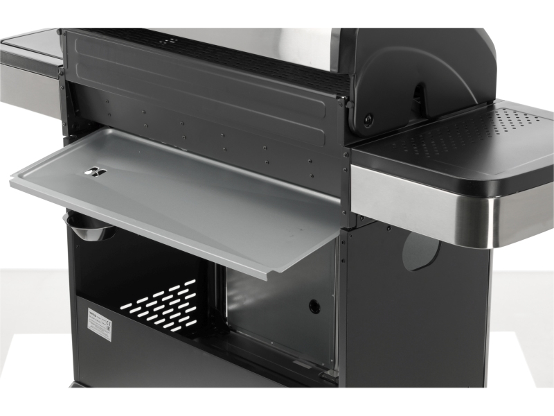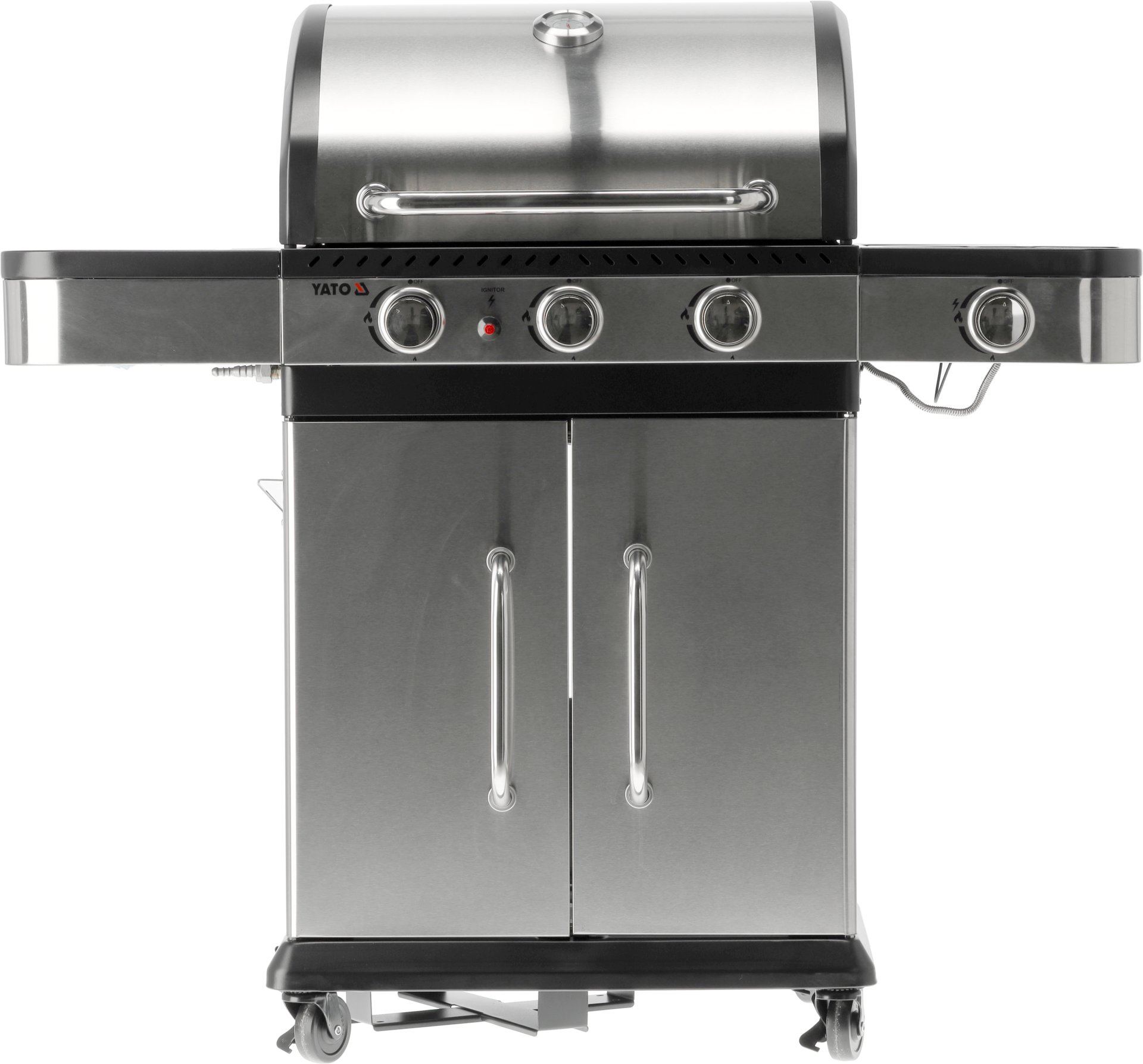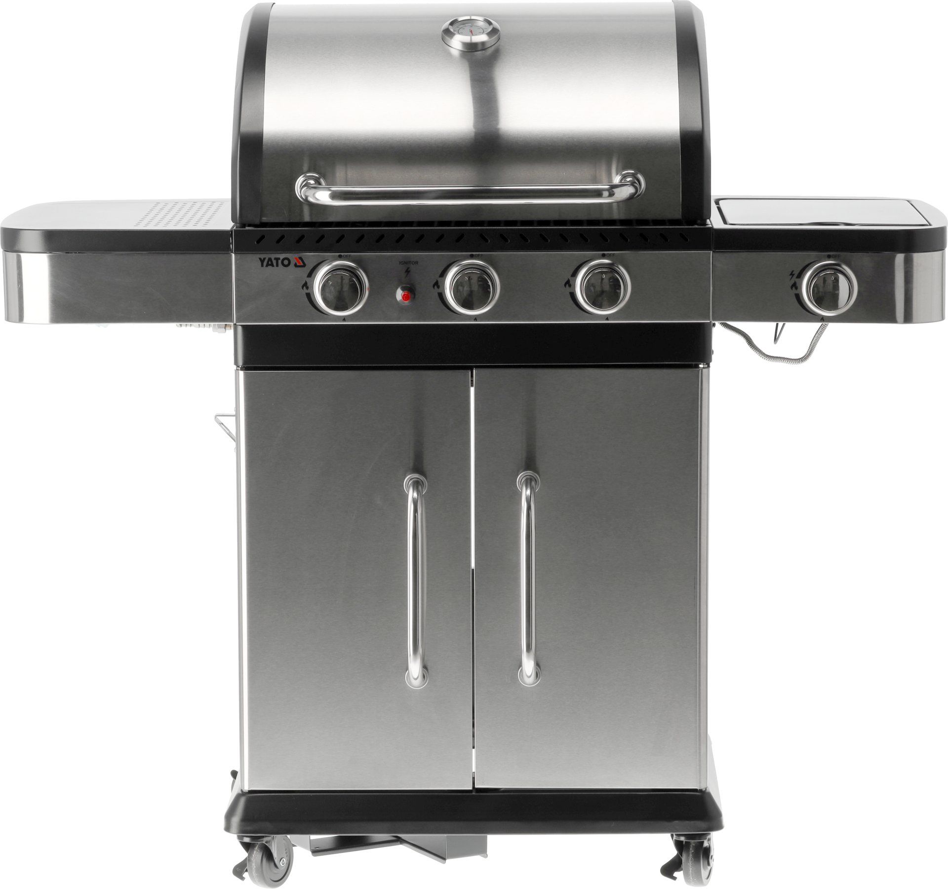 Grătar pe gaz portabil cu cinci arzătoare, suprafață de gătire din fontă și capac cu termometru, destinat utilizării în aer liber.