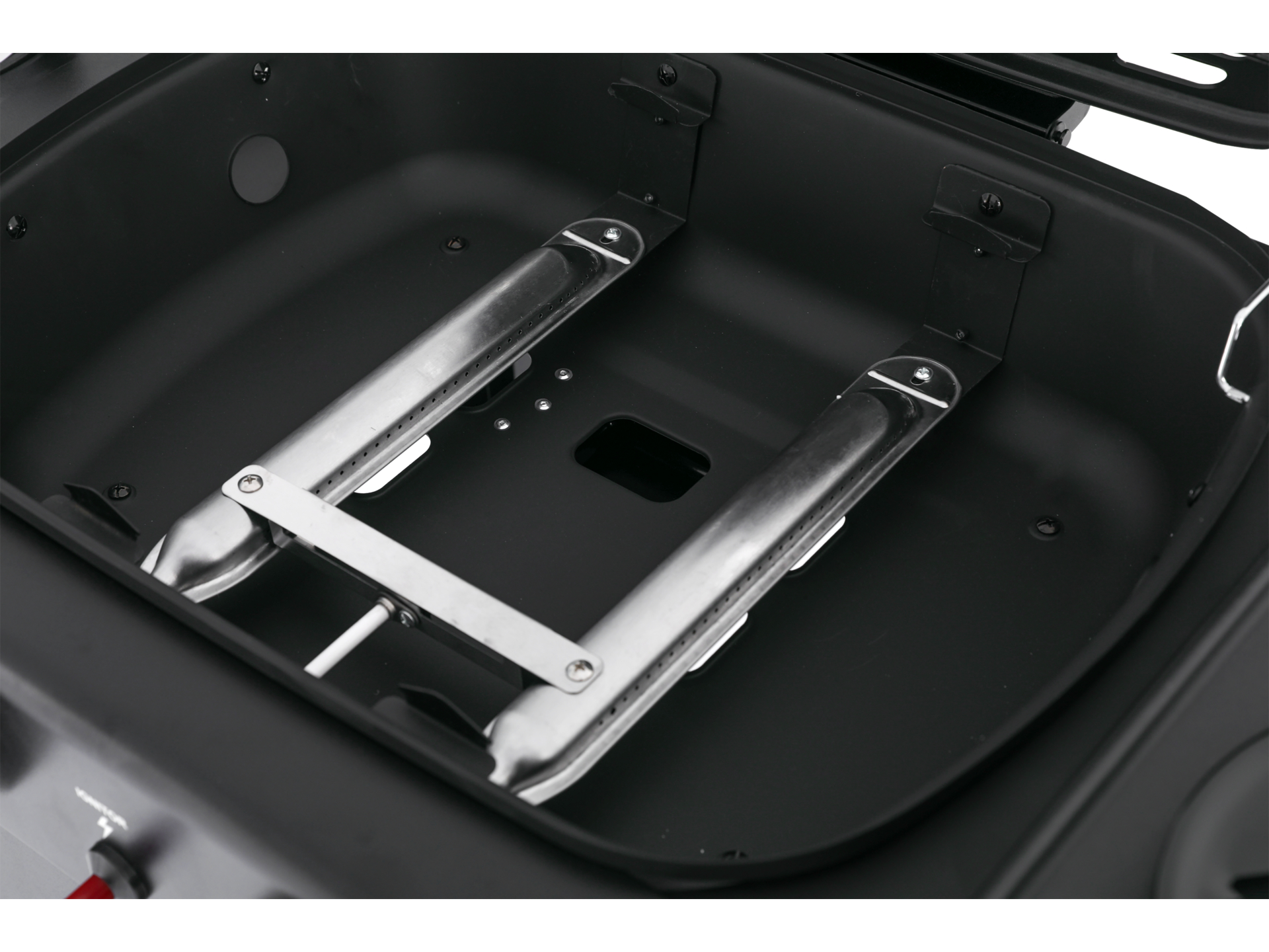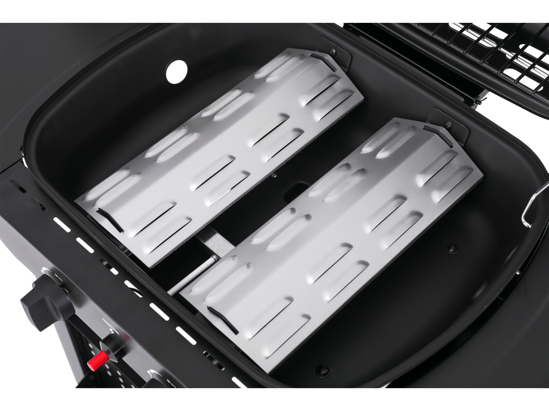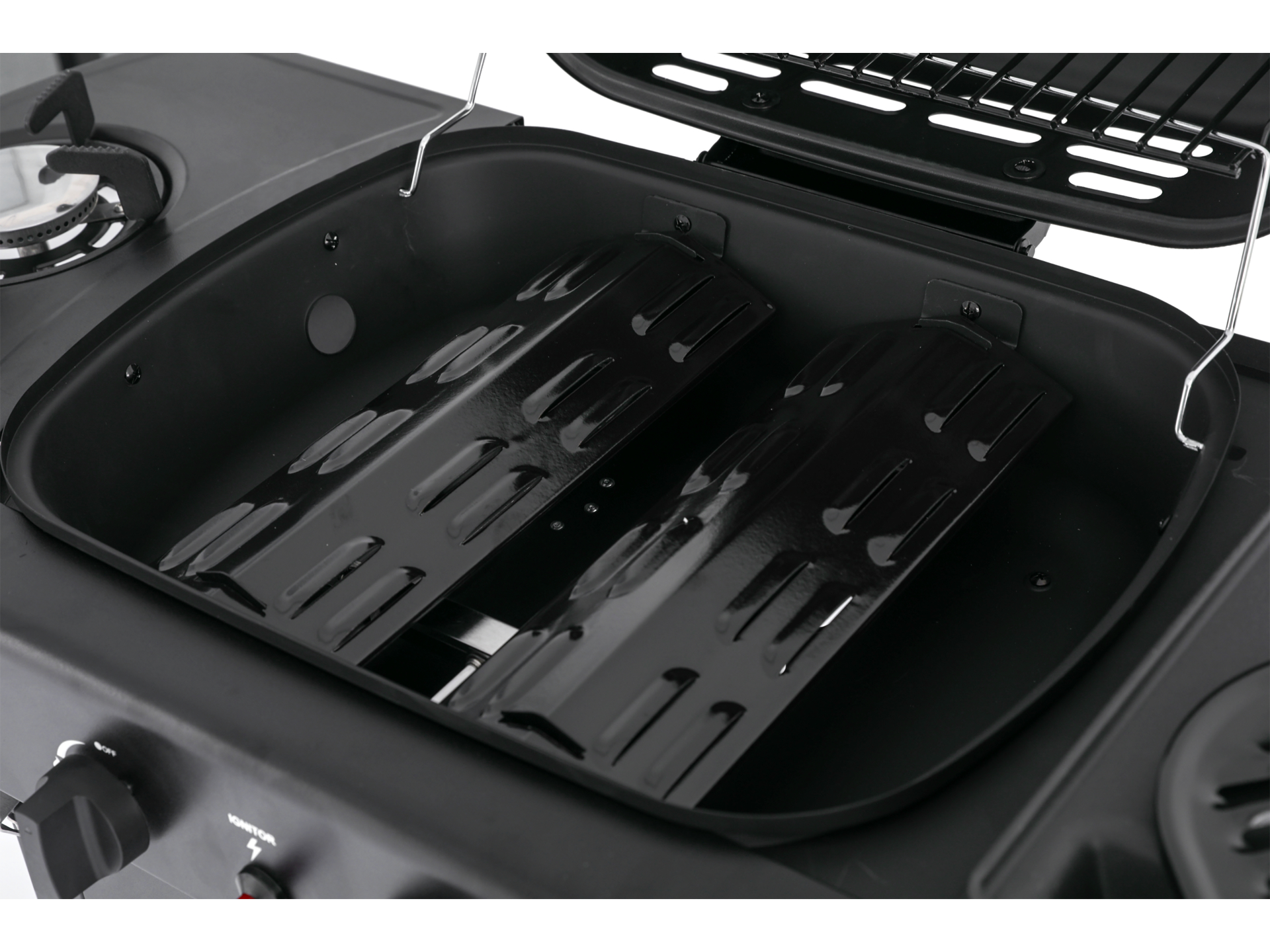 Grătar pe gaz portabil cu două arzătoare de 5 kW, termometru și design compact, destinat utilizării în aer liber.