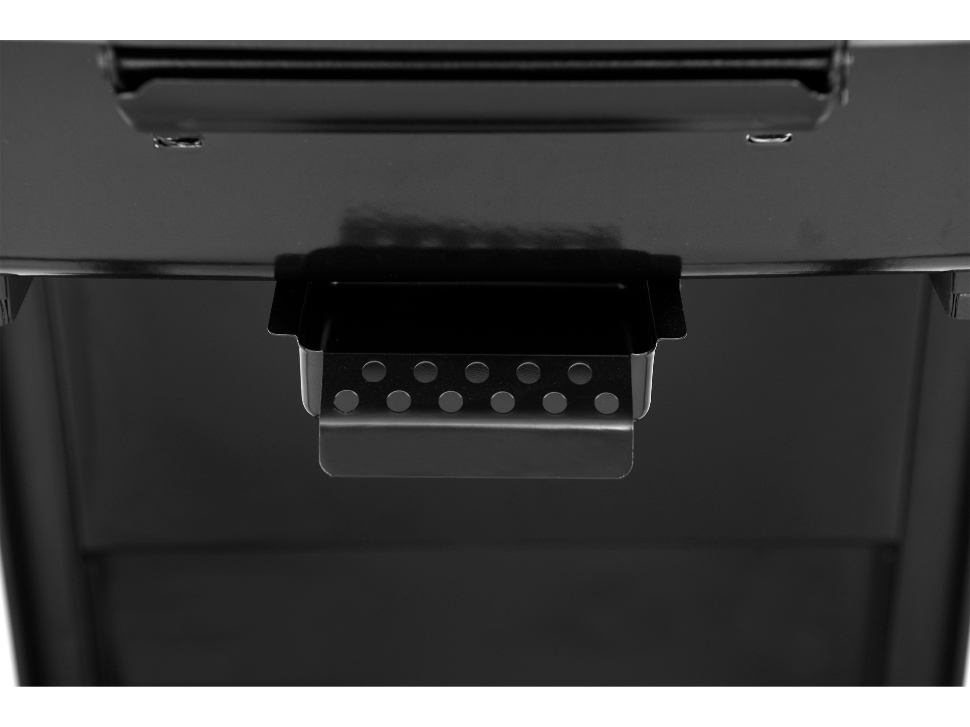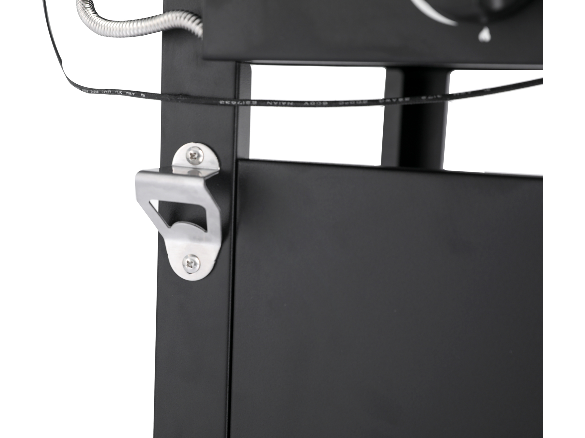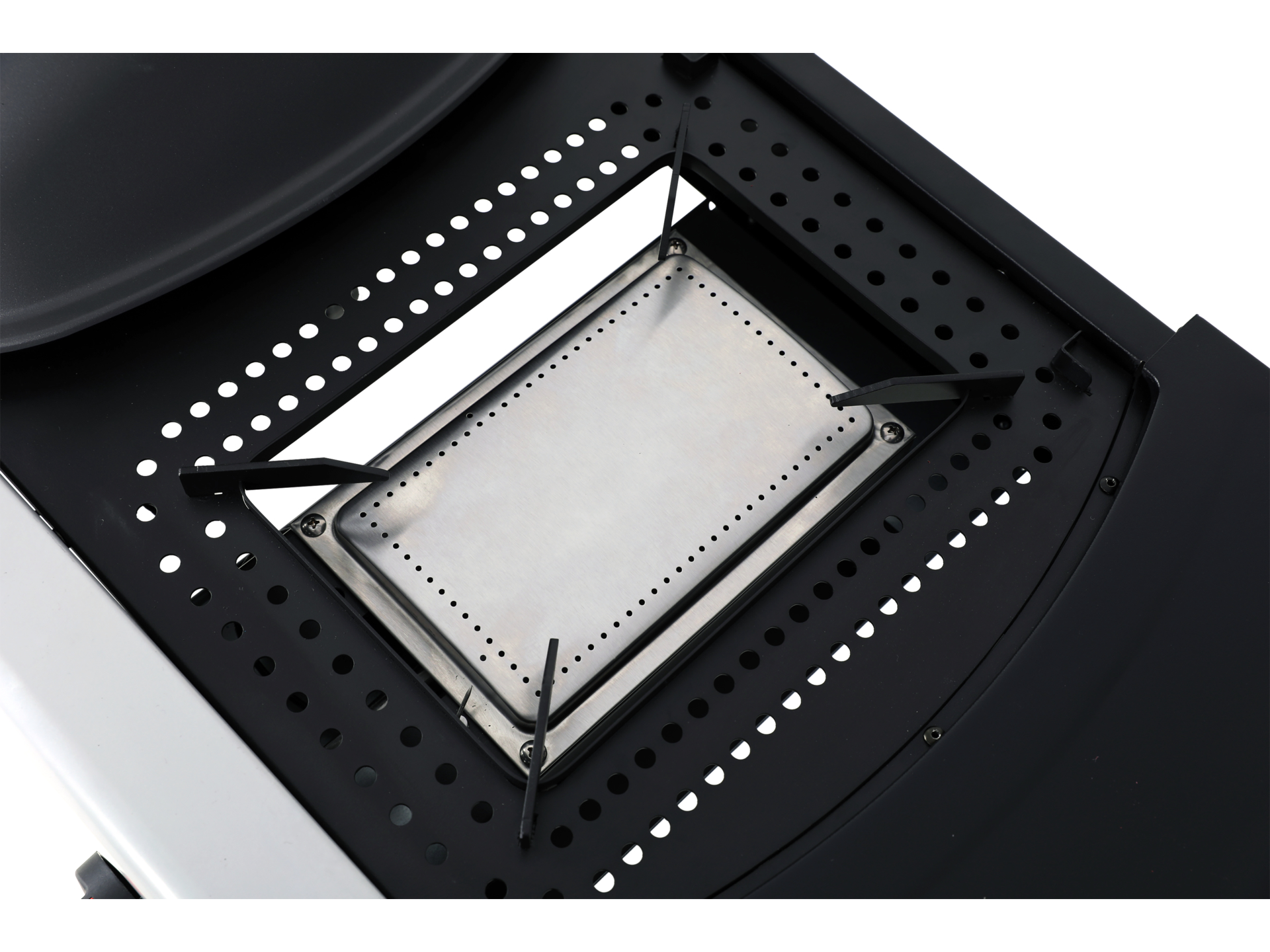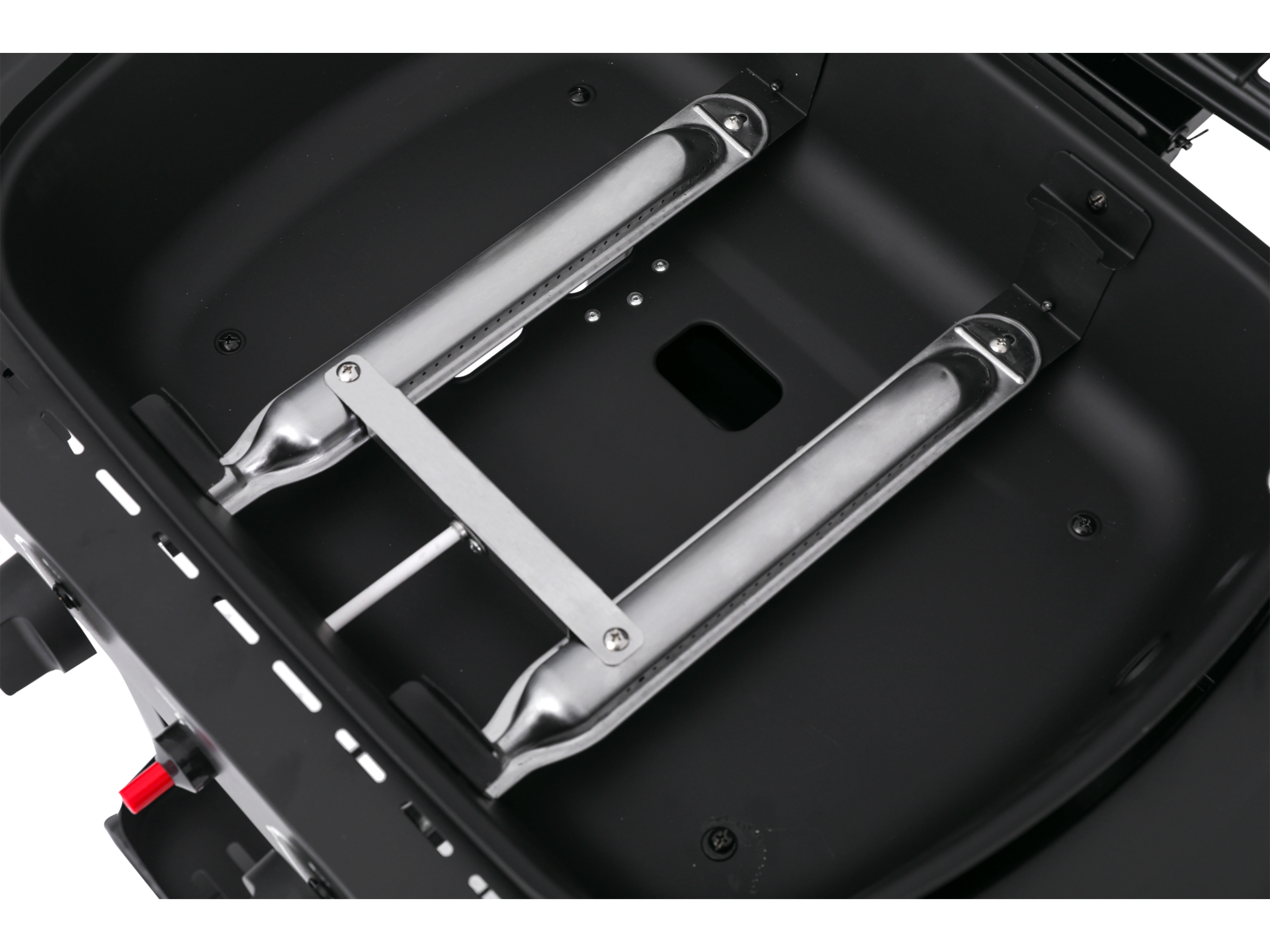 Grătar pe gaz portabil cu două arzătoare de 5 kW, termometru și design compact, destinat utilizării în aer liber.