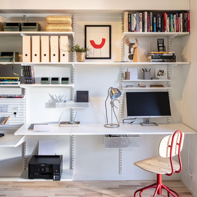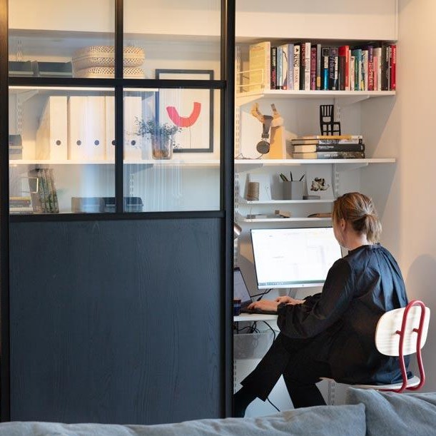 Soluția de birou ascuns în spatele unor uși glisante transformă orice încăpere într-un spațiu multifuncțional. Mobilerul modular, cu rafturi ajustabile și organizatoare modulare, optimizează organizarea documentelor și a obiectelor personale. Masa integrată și compartimentele suplimentare asigură un birou ordonat și practic. Când nu este folosit, biroul devine invizibil, iar zona de lucru poate fi ascunsă, oferind o atmosferă curată. La prima vedere, pare o bibliotecă elegantă, dar în spatele ușilor glisante se află un colț funcțional de lucru.