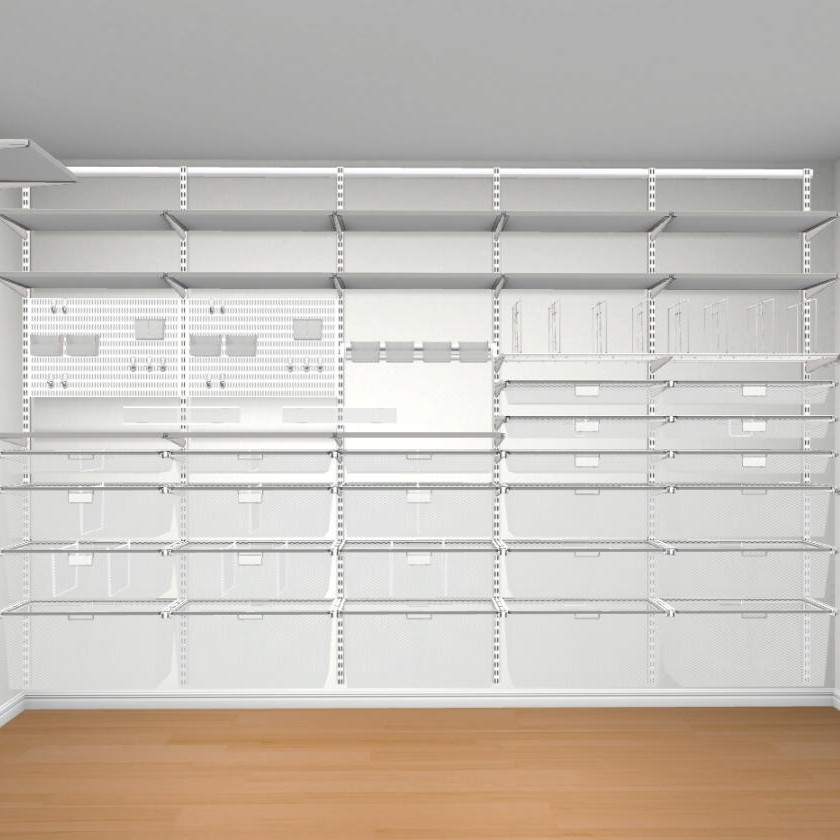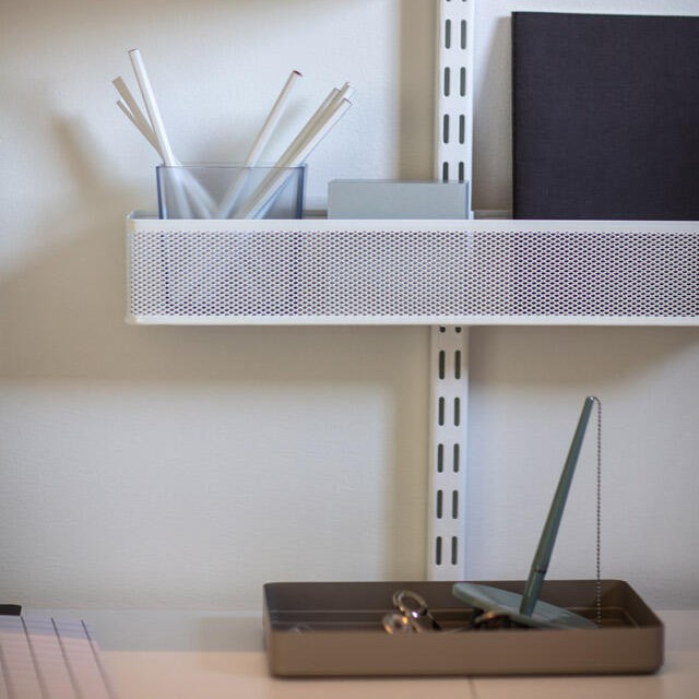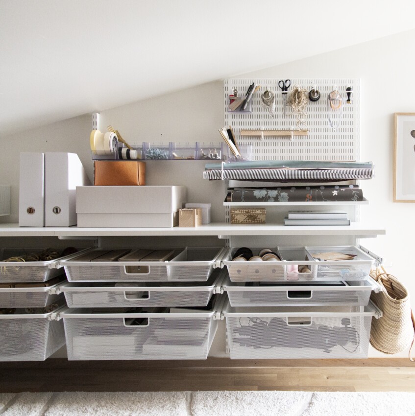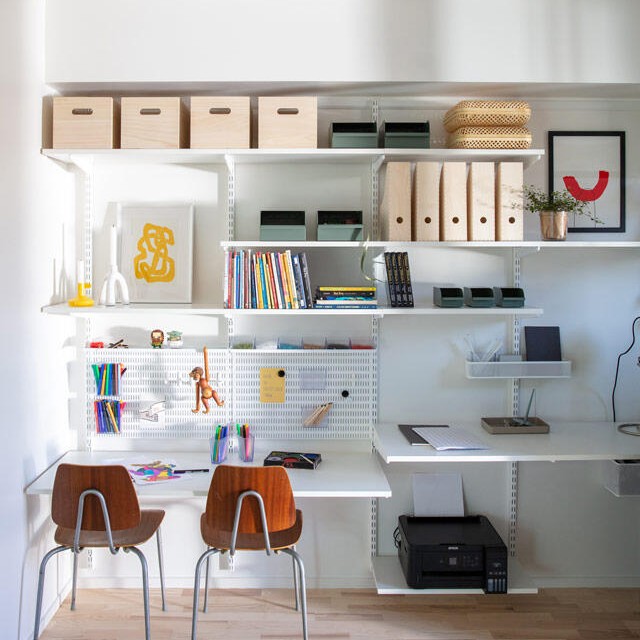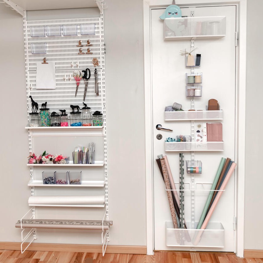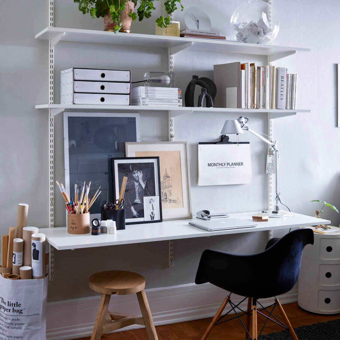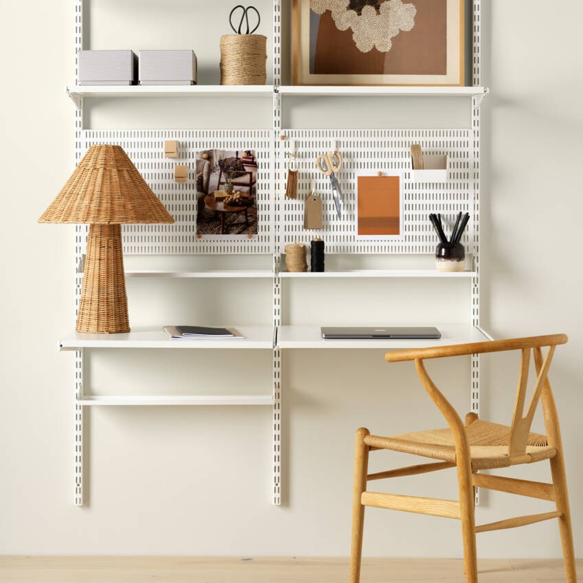 Soluție completă pentru birou acasă, cu sistem de rafturi metalice reglabile, panou vertical pentru accesorii și masă ajustabilă. Ideală pentru activități de hobby, lucru creativ și organizare eficientă. Design compact, perfect pentru spații mici, bine structurat și funcțional.