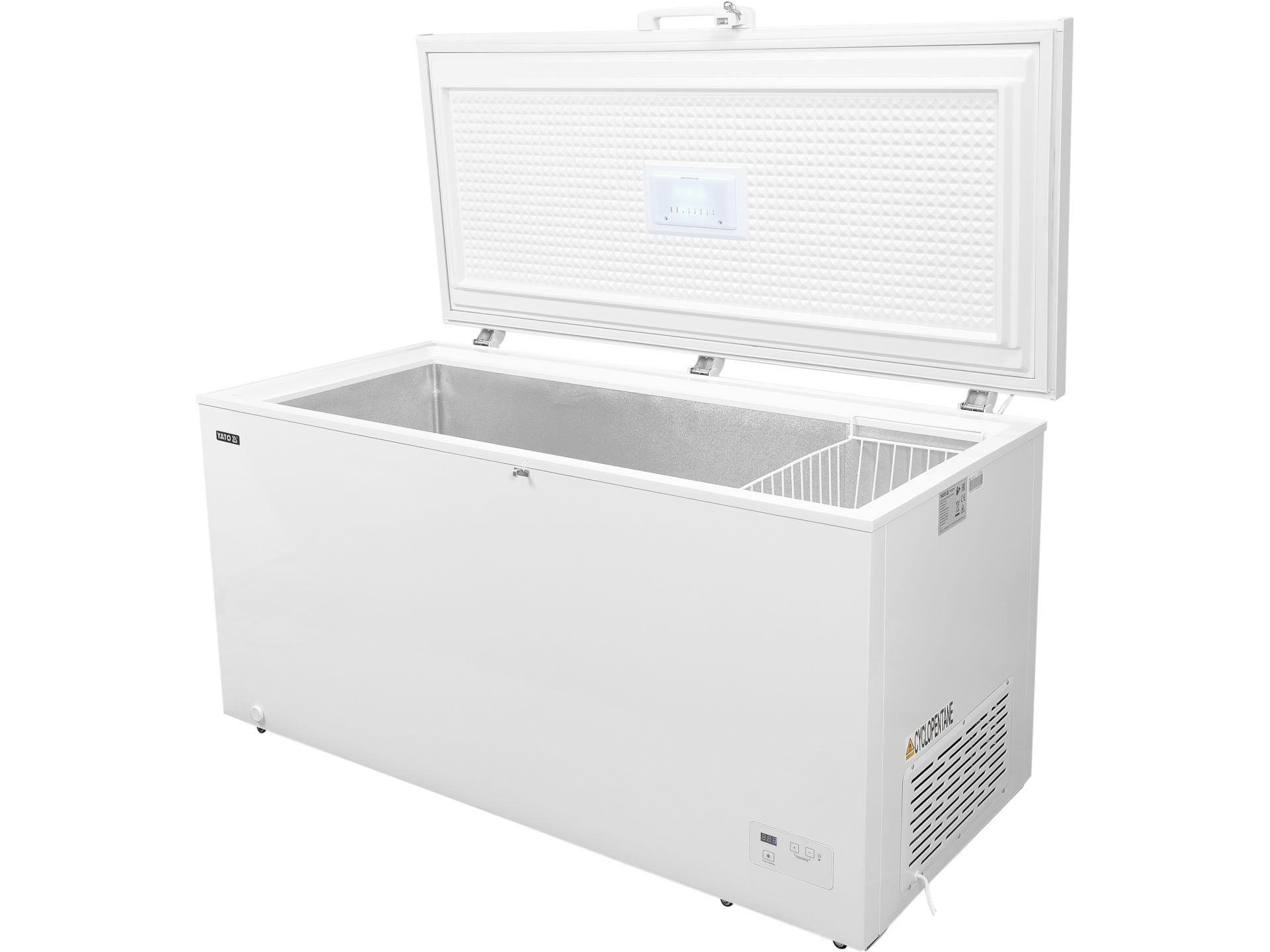 Lada frigorifică YATO cu o capacitate de 282 litri are dimensiunile de 1116x644x845 mm și funcționează într-un interval de temperatură de la -24 până la +10 ˚C este echipată cu un congelator și un coș de sârmă carcasa este fabricată din oțel și are o masă de 42 kg funcționează la o tensiune de 220-240 V a.c.