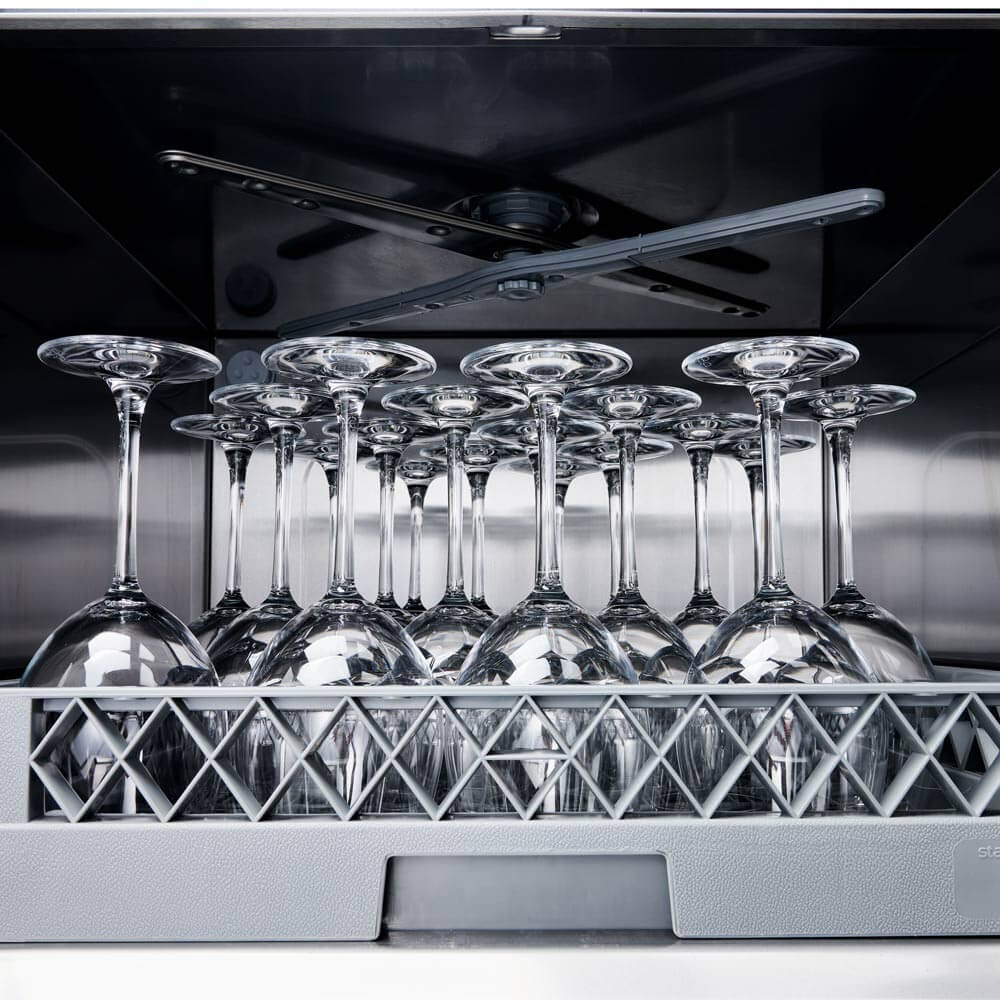 Această mașină de spălat vase profesională are un design modern și este echipată cu o funcție de abur. Utilizează control electromecanic, asigurând o utilizare ușoară datorită marcajelor lizibile și durabile de pe panoul de control.