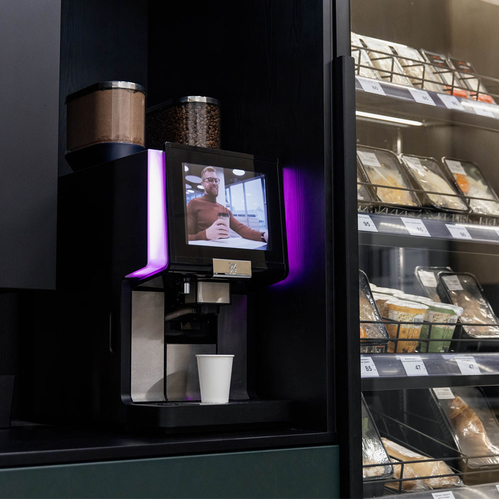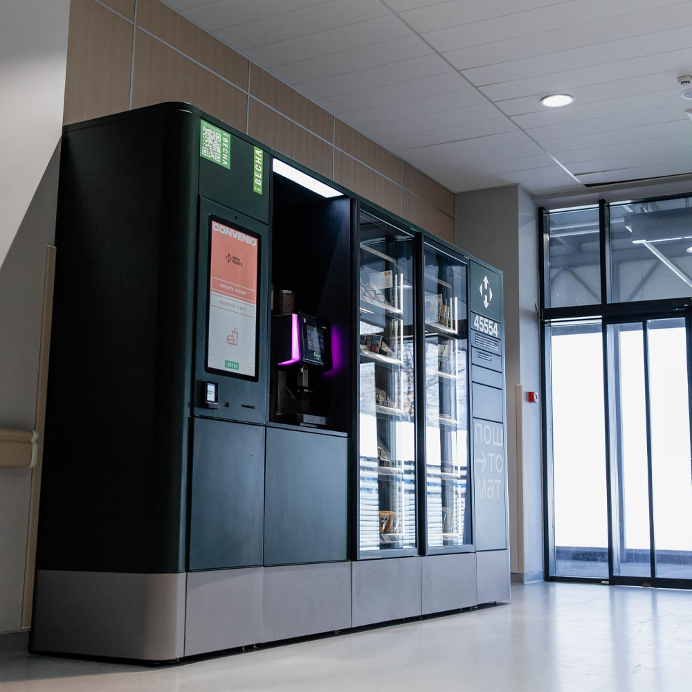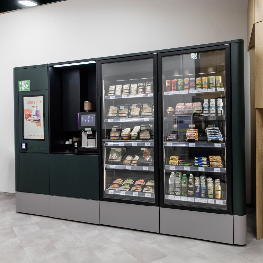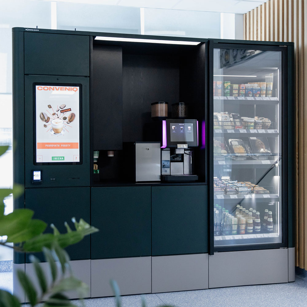 CONVENIQ combină un frigider Grab&Go, un locker de colete și un modul de cafea într-un singur dispozitiv, controlat prin software integrat.
