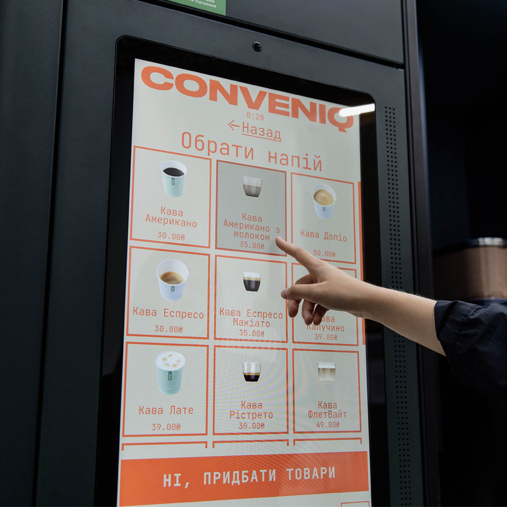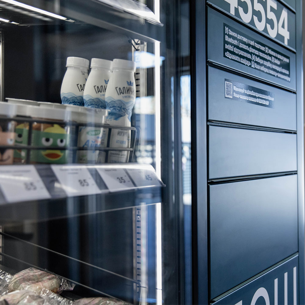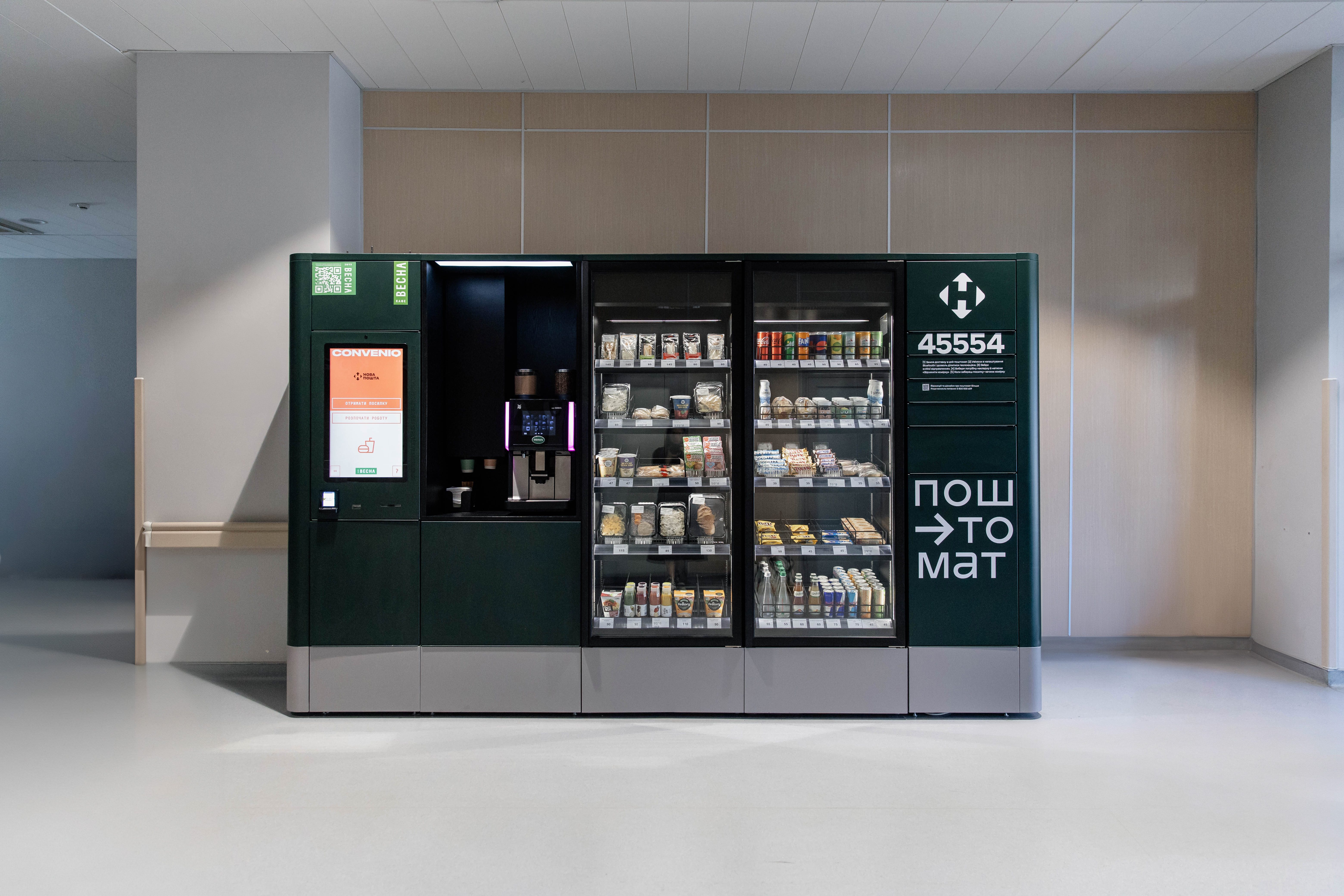 CONVENIQ combină un frigider Grab&Go, un locker de colete și un modul de cafea într-un singur dispozitiv, controlat prin software integrat.