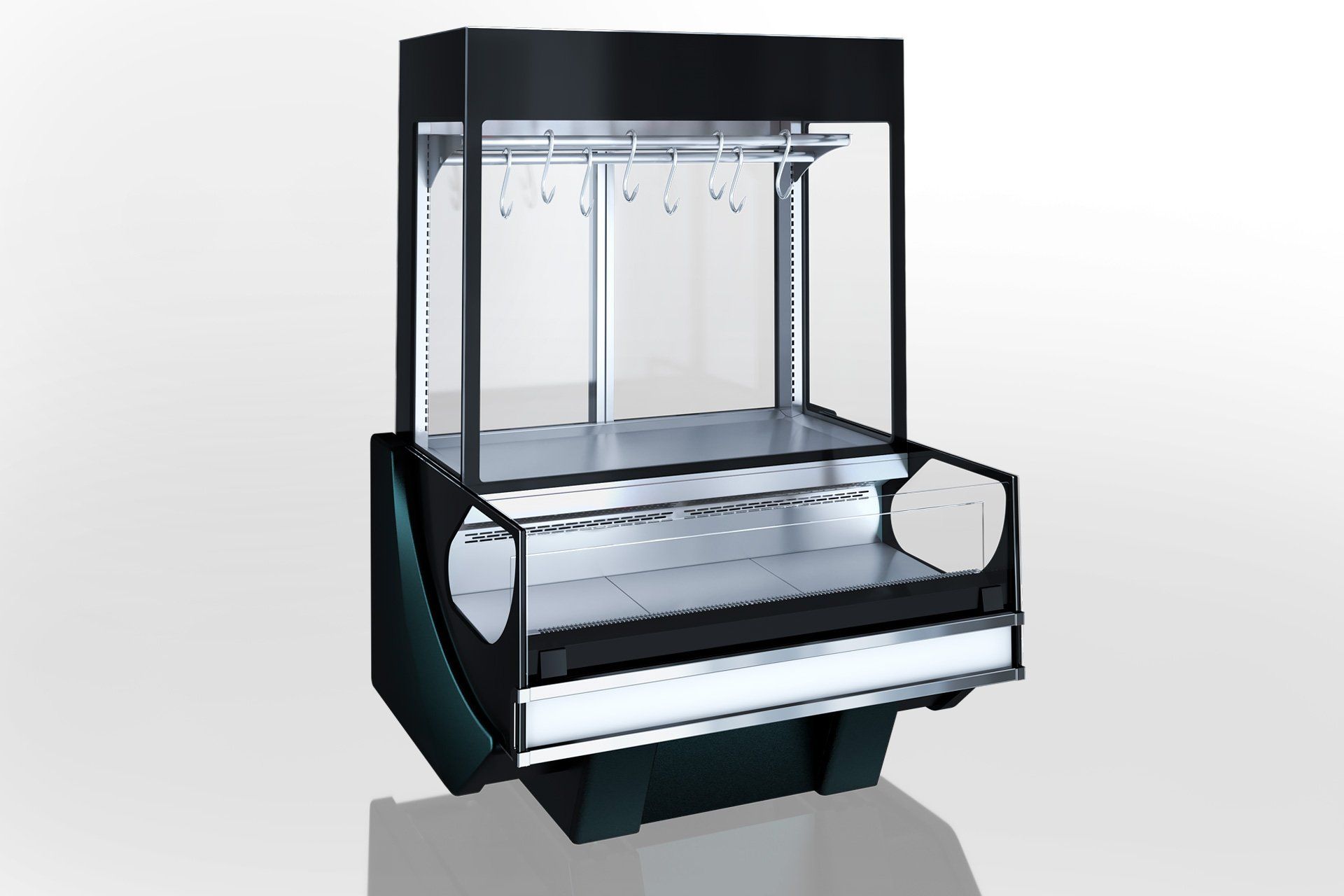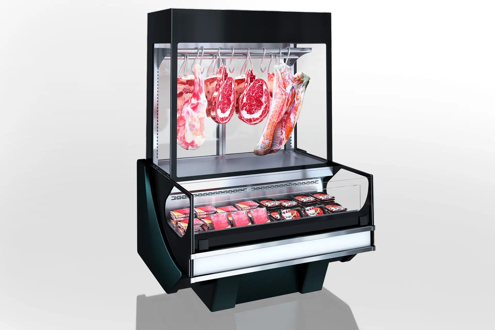Raft specializat pentru carne proaspătă pe cârlige și parte suplimentară de vitrină cu autoservire. Se conectează la sistemul de răcire la distanță pentru partea de autoservire și este compatibil cu modul plug-in pentru învelișul superior al părții de vitrină.