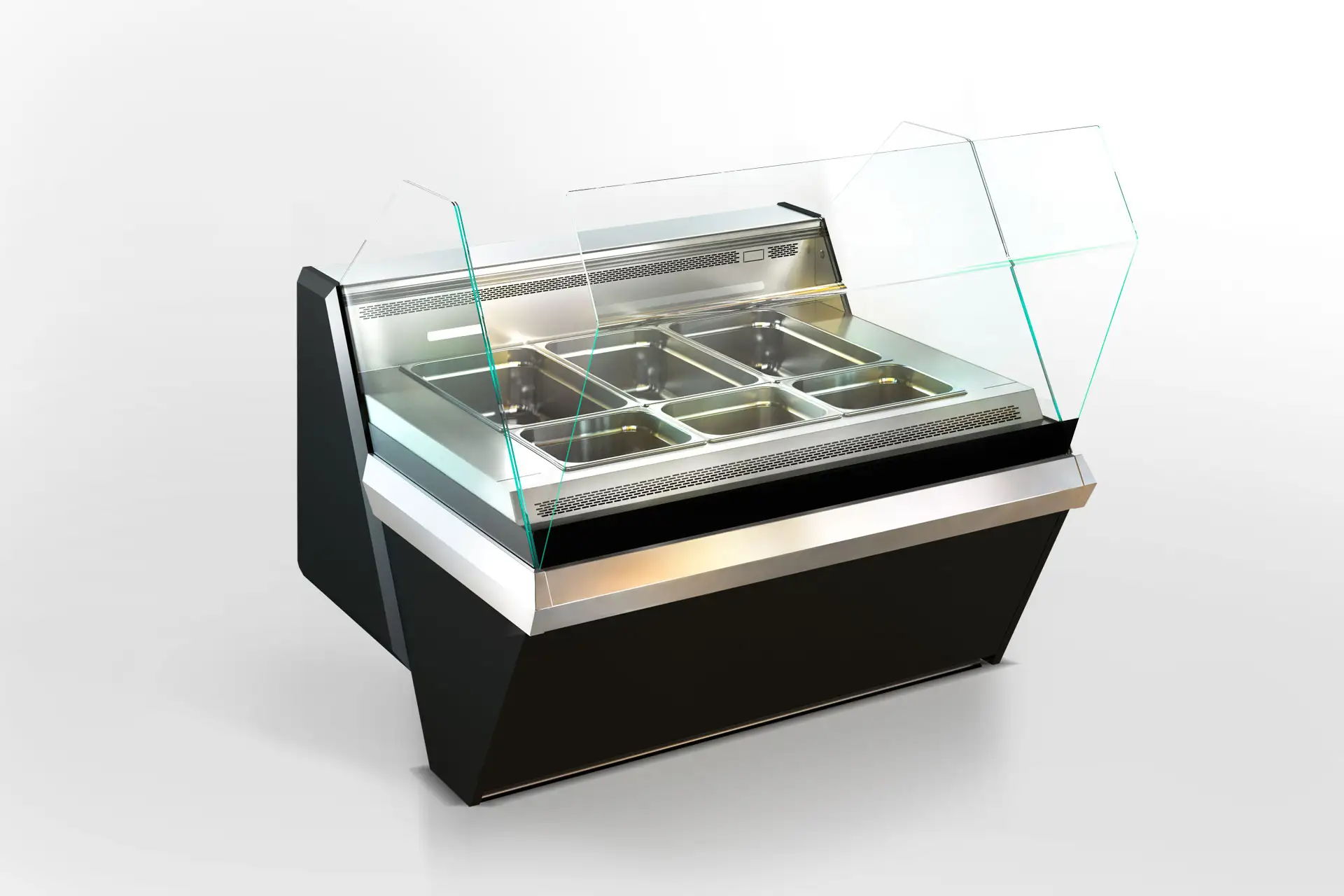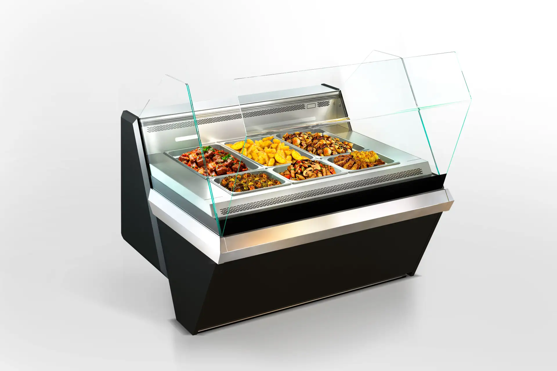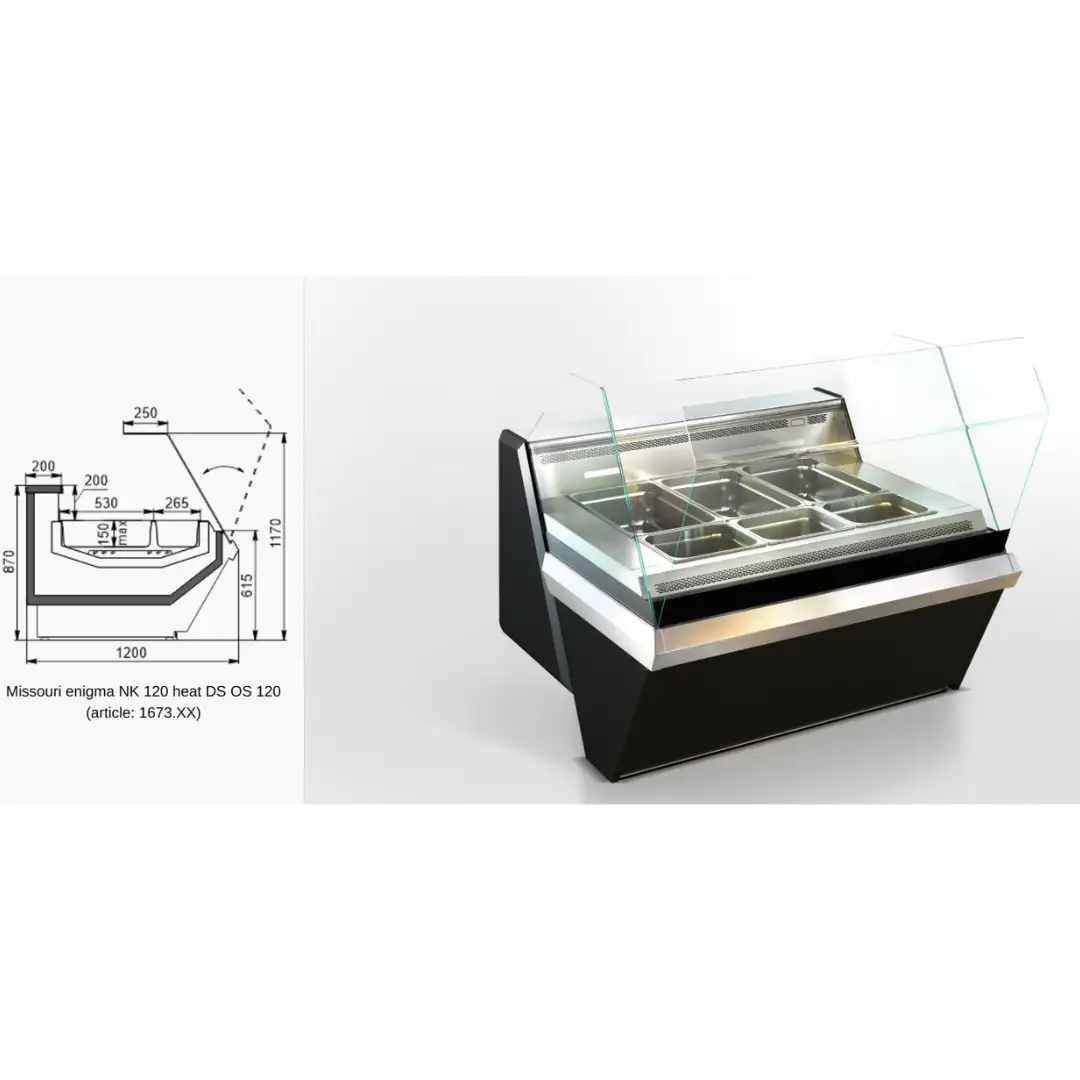 Vitrină profesională Missouri Enigma NK 120 Heat DS OS destinată prezentării și menținerii temperaturii preparatelor calde în restaurante, supermarketuri și unități HoReCa.