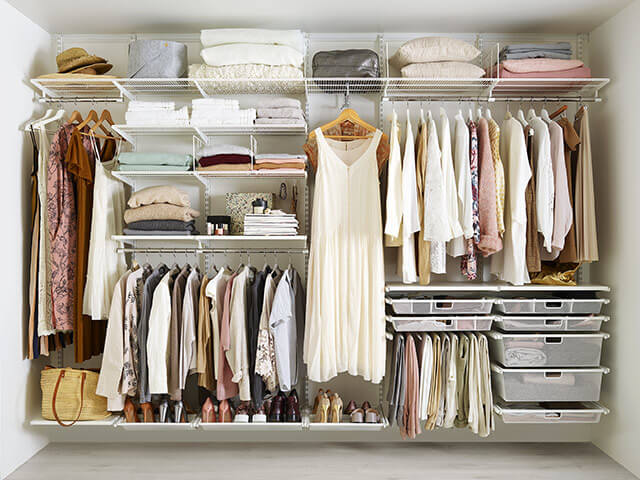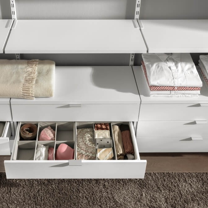 Mobilier pentru dormitor cu structură deschisă, special conceput pentru organizarea impecabilă a hainelor, pantofilor și accesoriilor. Sistemul modular include sertare, rafturi, suporturi și bare pentru umerașe, oferind soluții de depozitare eficiente și adaptabile oricărui spațiu de locuit.