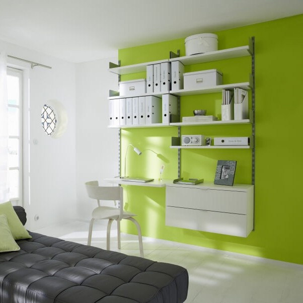 Mobilier suspendat modern, ideal pentru dormitor sau spații multifuncționale. Sistemul include rafturi reglabile, un birou de lucru minimalist și sertare încăpătoare, oferind o soluție eficientă de organizare a documentelor, cărților și obiectelor personale. Designul compact economisește spațiu și creează un ambient ordonat și luminos.