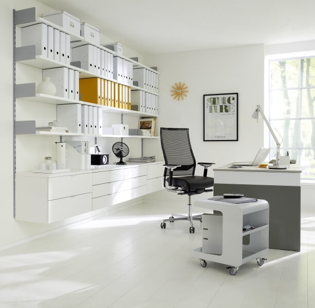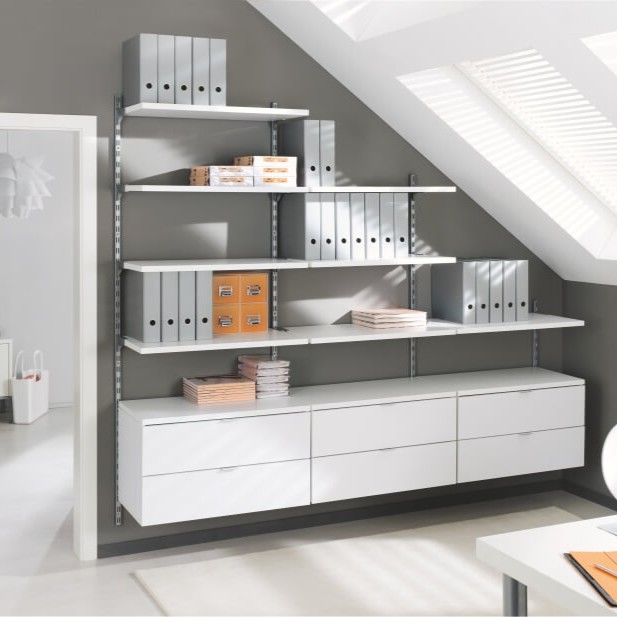 Mobilier de birou suspendat, cu design modern, compus din rafturi deschise și sertare montate pe perete, ideal pentru organizarea documentelor, dosarelor și accesoriilor. Soluția practică și elegantă pentru amenajarea unui spațiu de lucru eficient, aerisit și bine compartimentat. Perfect pentru birouri profesionale sau home office-uri.
