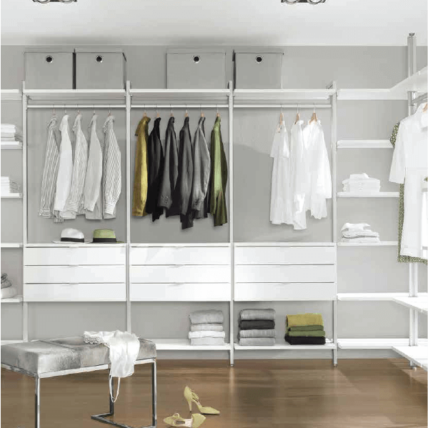 Sistem modular pentru dulapuri, prevăzut cu rafturi deschise, cutii de depozitare și sertare compartimentate. Oferă o soluție practică pentru organizarea eficientă a hainelor, lenjeriei și accesoriilor. Optimizează spațiul disponibil în dormitor, dressing sau garderobă.
