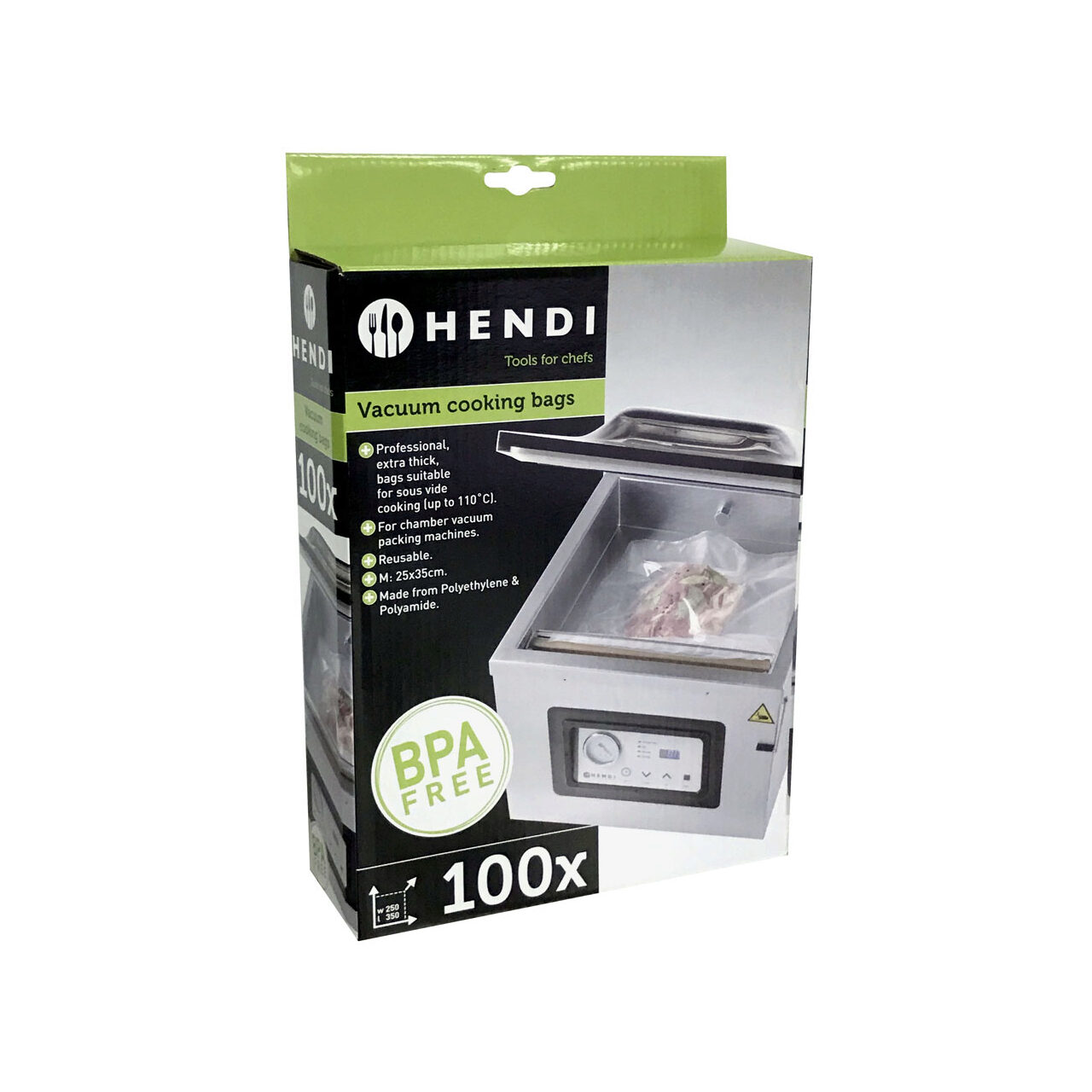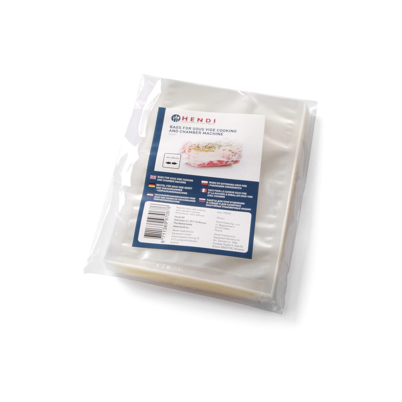 Potrivit pentru gătitul sous vide. 2 straturi, stratul interior de 60 µm poliester aprobat pentru contactul cu alimentele, stratul exterior de 15µm poliamidă (nylon). Grosimea totală este de 75 µm.