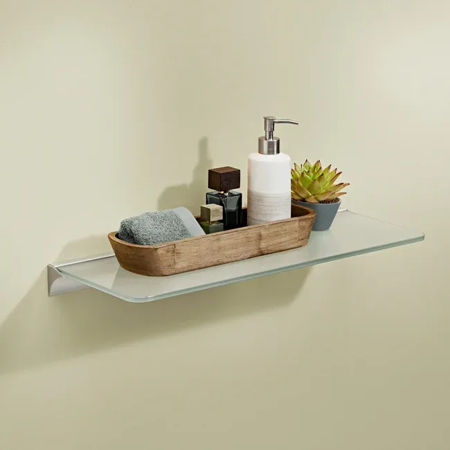Raft din sticlă cu un design minimalist, ideal pentru depozitarea în baie a produselor de toaletă, cosmeticelor sau accesoriilor uzuale.
