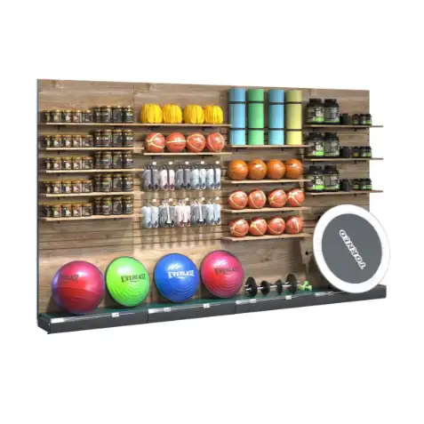 Peretele modular cu design premium este soluția ideală pentru organizarea și expunerea suplimentelor, accesoriilor fitness și echipamentelor sportive. Soluție versatilă de expunere este potrivită pentru farmacii, săli de sport, magazine de nutriție și centre de recuperare. Acest sistem combină rafturi reglabile, suporturi metalice și panouri din lemn pentru un aspect modern și funcțional. Vitrina oferă vizibilitate optimă și acces facil la produse diverse: mingi de fitness, gantere, saltele, suplimente și accesorii de antrenament.