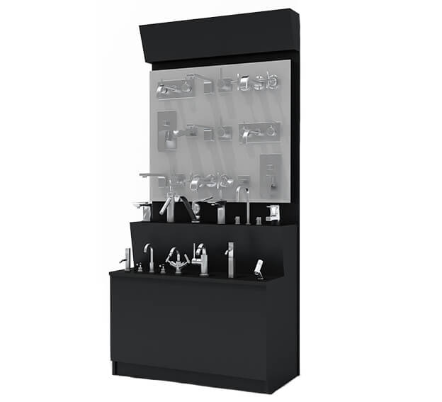Stand de prezentare pentru baterii și accesorii sanitare, proiectat pentru a optimiza spațiul și a oferi acces ușor la produse. Cu un design modern și organizat, asigură o expunere clară și atractivă, punând în valoare atât estetica, cât și funcționalitatea obiectelor expuse. Ideal pentru showroom-uri, magazine sau expoziții, acest stand contribuie la o experiență plăcută pentru clienți și la o vizibilitate superioară a produselor, adăugând un plus de eleganță și profesionalism oricărui spațiu comercial.