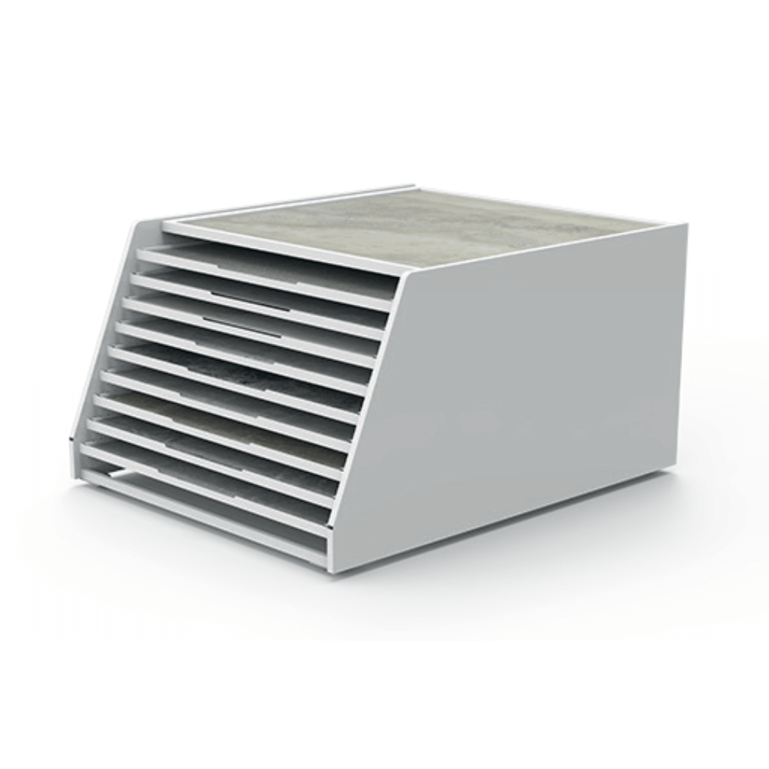 Stand pentru teracotă cu un design robust și compact, special conceput pentru expunerea organizată a plăcilor de teracotă de 600x600mm. Capacitatea sa de 28 de bucăți permite o prezentare eficientă, maximizând spațiul disponibil. Designul vertical asigură vizibilitate optimă și acces facil la fiecare model, iar finisajul antracit oferă un aspect modern și profesional, ideal pentru showroom-uri, magazine și expoziții.