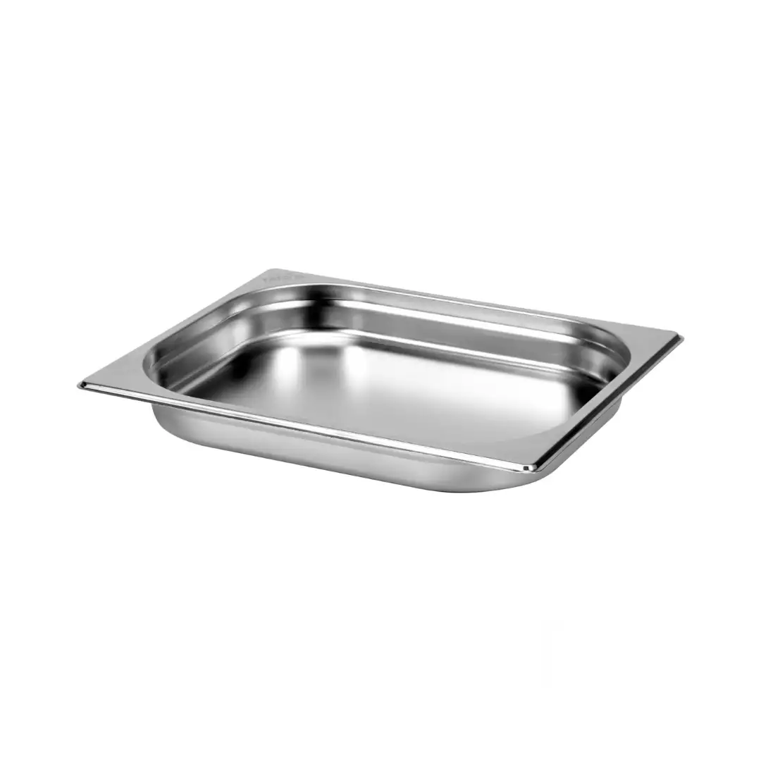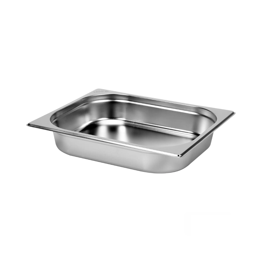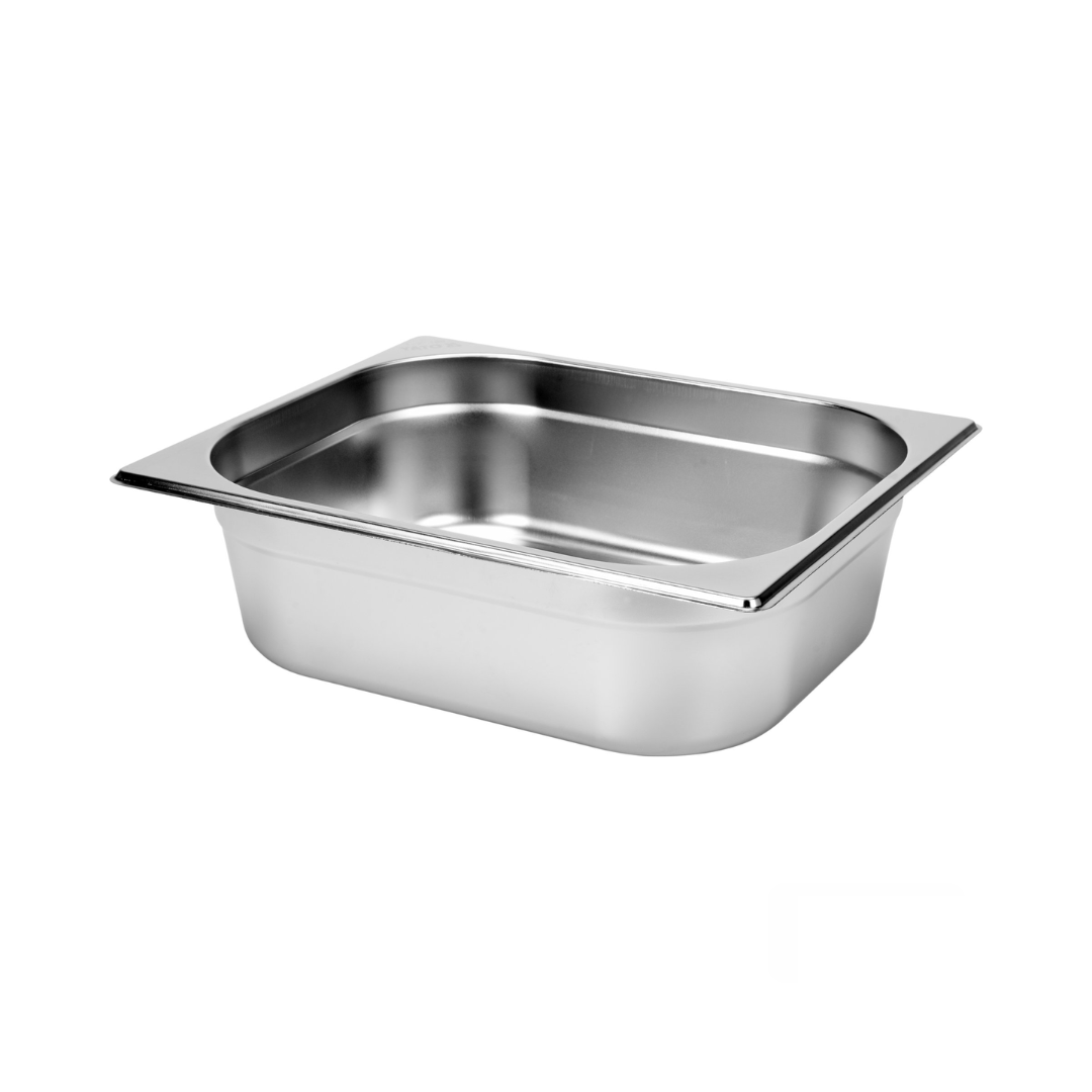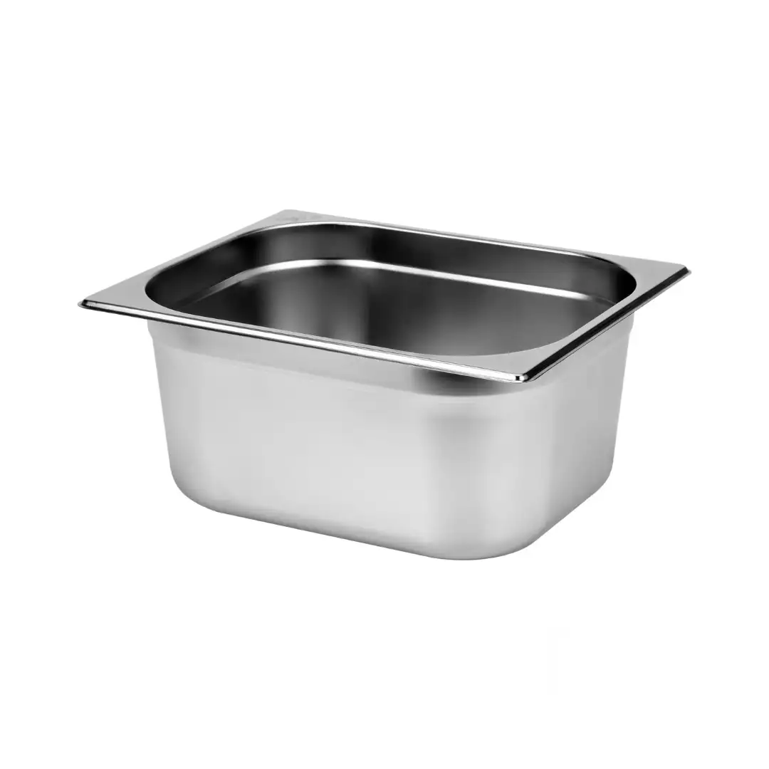 Recipient GN1/2 din oțel inoxidabil, recipient gastronorm profesional, recipient metalic alimentar pentru bucătărie profesională, construcție durabilă din inox, suprafață netedă, rezistență ridicată la coroziune și temperaturi înalte.