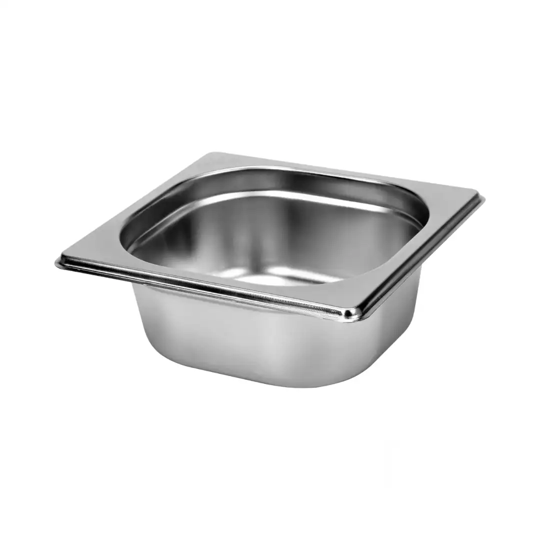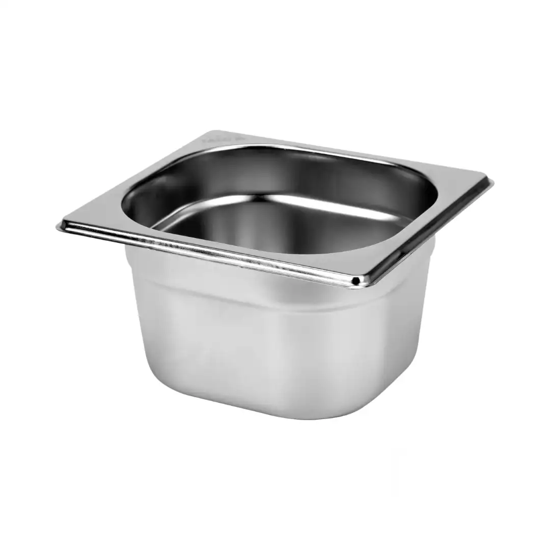 Recipient GN1/6 din oțel inoxidabil, recipient gastronorm profesional, recipient metalic alimentar pentru bucătărie profesională, construcție durabilă din inox, suprafață netedă, rezistență ridicată la coroziune și temperaturi înalte. Recipiente GN1/6 din oțel inoxidabil disponibile în mai multe înălțimi și capacități: H 65 mm – 1 L, H 100 mm – 1,5 L, H 150 mm – 2,2 L, H 200 mm – 3 L.