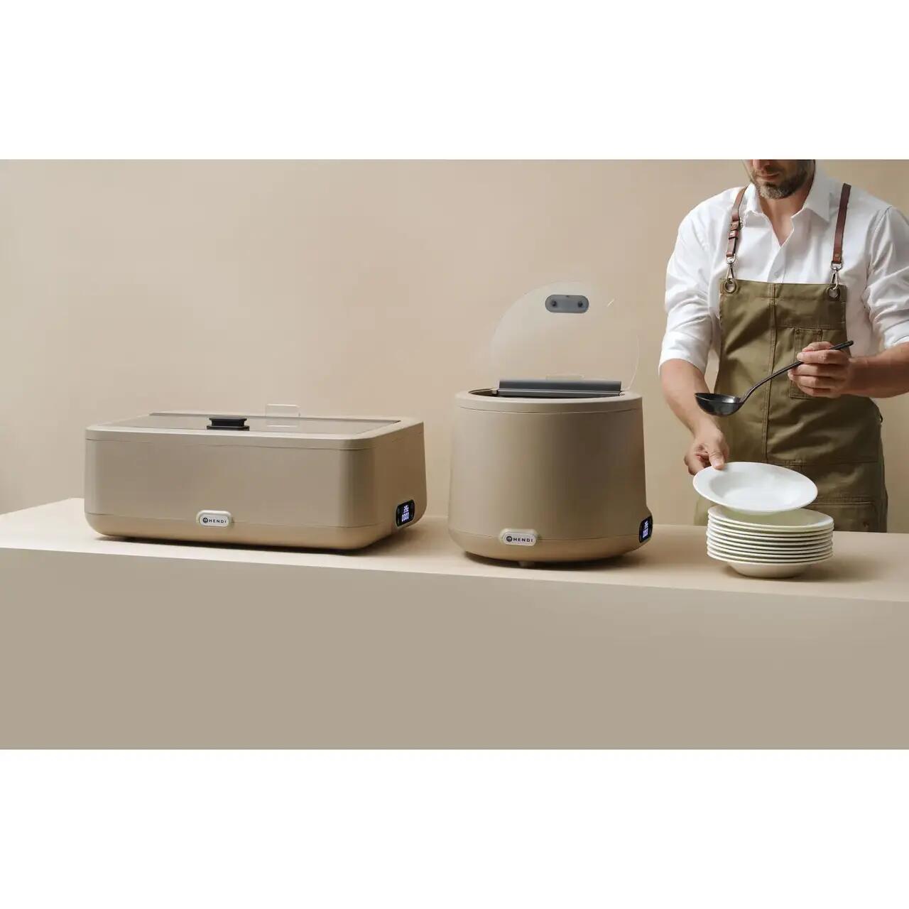 HENDI UNIQ a fost proiectat de cunoscutul designer olandez Robert Bronwasser și este disponibil în 4 culori elegante. Carcasa modernă dispune de câteva funcții remarcabile. Ultima temperatură setată este stocată în memorie. Pur și simplu conectați, umpleți rezervorul cu apă și vasul de încălzire va menține tocănițele, carnea, legumele fierte, pastele, sosurile și orice alte preparate la temperatura perfectă de servire.
