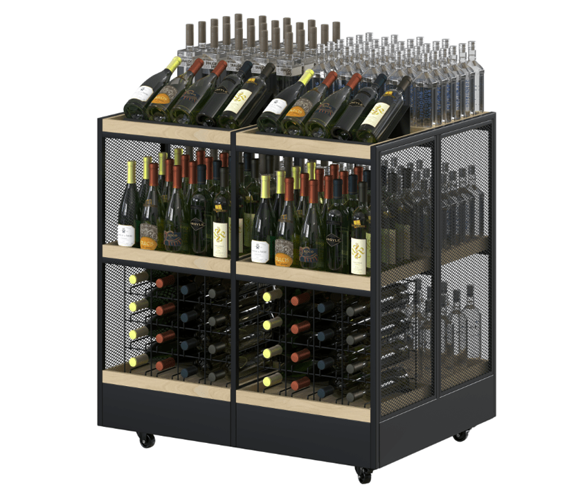 Mobilier comercial modular cu 3 nivele pentru băuturi alcoolice, care oferă o prezentare la 360° și flexibilitate maximă în organizarea produselor, ideal pentru vinoteci, magazine specializate, supermarketuri și depozite de băuturi. Construcția include cadru metalic perforat, rafturi din PAL, suporturi din sârmă și roți pentru mobilitate. Sistemul de rafturi este o soluție completă pentru expunerea profesională a sticlelor de vin, perfectă pentru zone promoționale cu acces rapid.