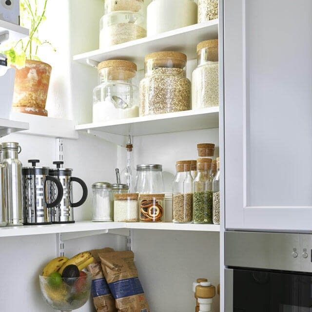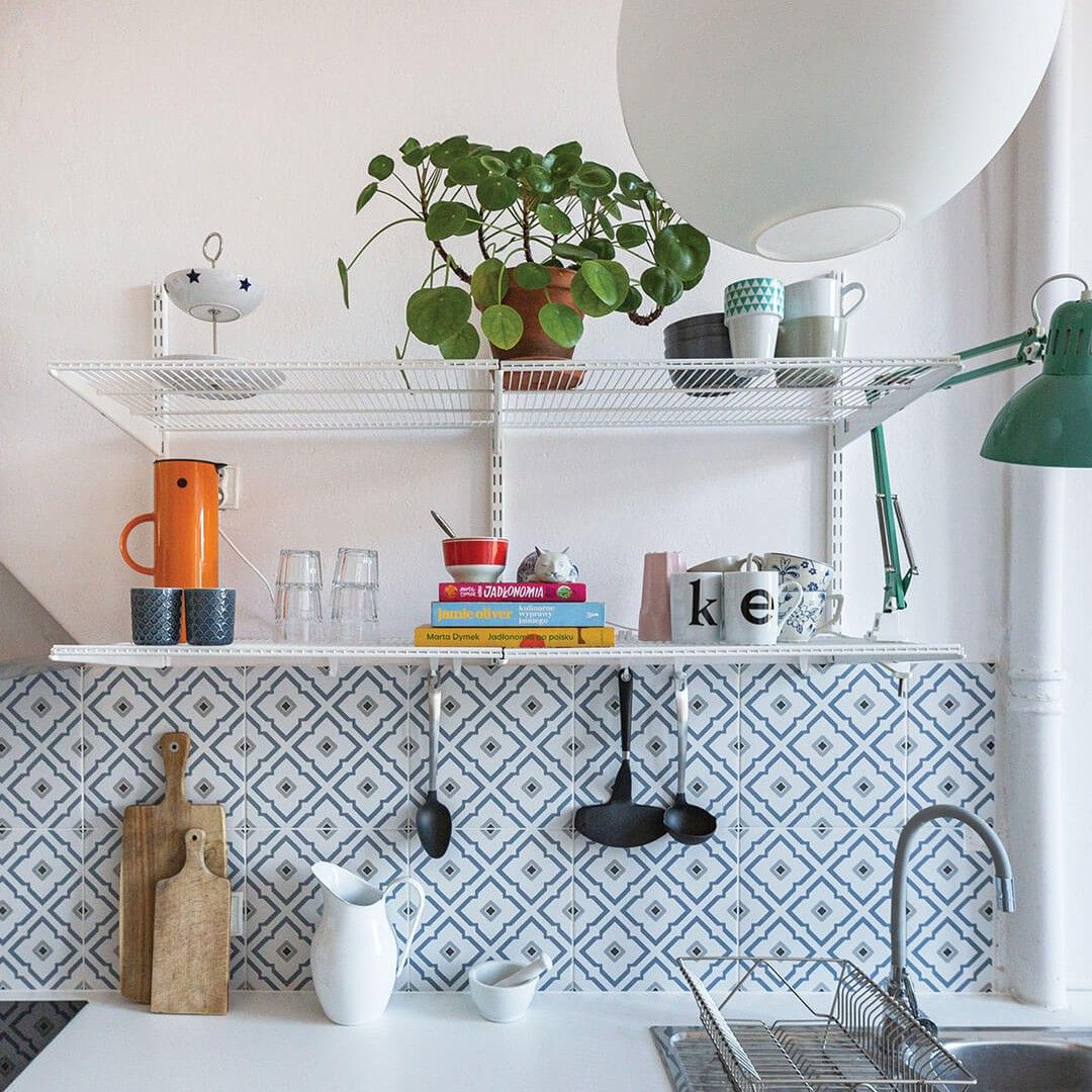 Sistem modular de organizare pentru bucătărie, cu rafturi ajustabile, suporturi suspendate și panou metalic. Ideal pentru depozitarea cănilor, ustensilelor și accesoriilor esențiale. O soluție practică și compactă care aduce ordine și funcționalitate în orice spațiu de bucătărie.