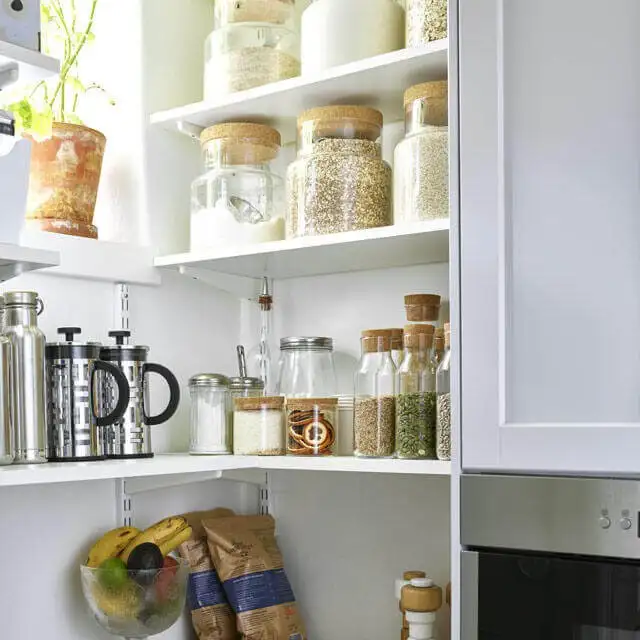 Soluție inteligentă de depozitare pentru bucătărie, cu rafturi deschise și compartimente practice pentru condimente, cereale, cafea și ingrediente esențiale. Designul funcțional oferă acces rapid, vizibilitate excelentă și organizare eficientă, ideal pentru bucătării moderne, compacte sau de tip cămară.
