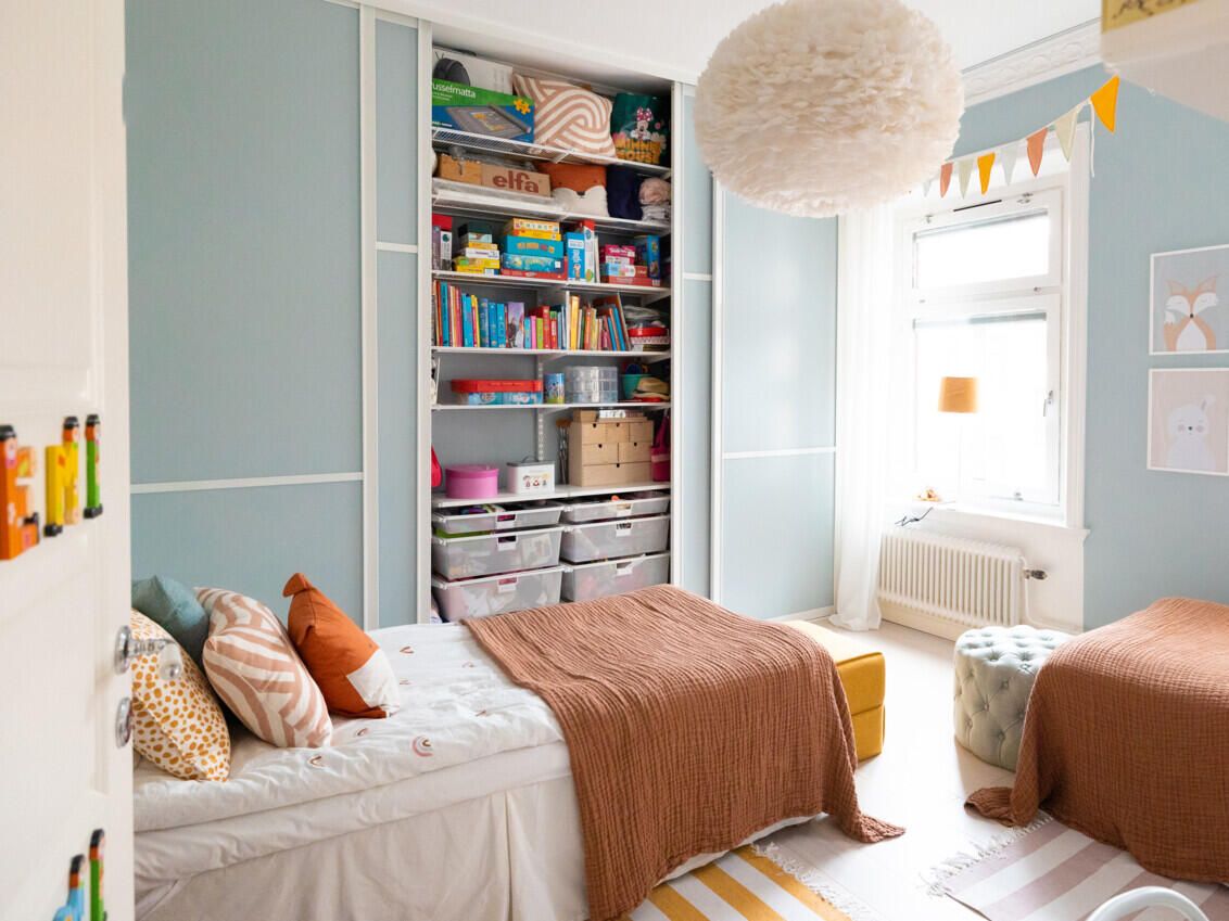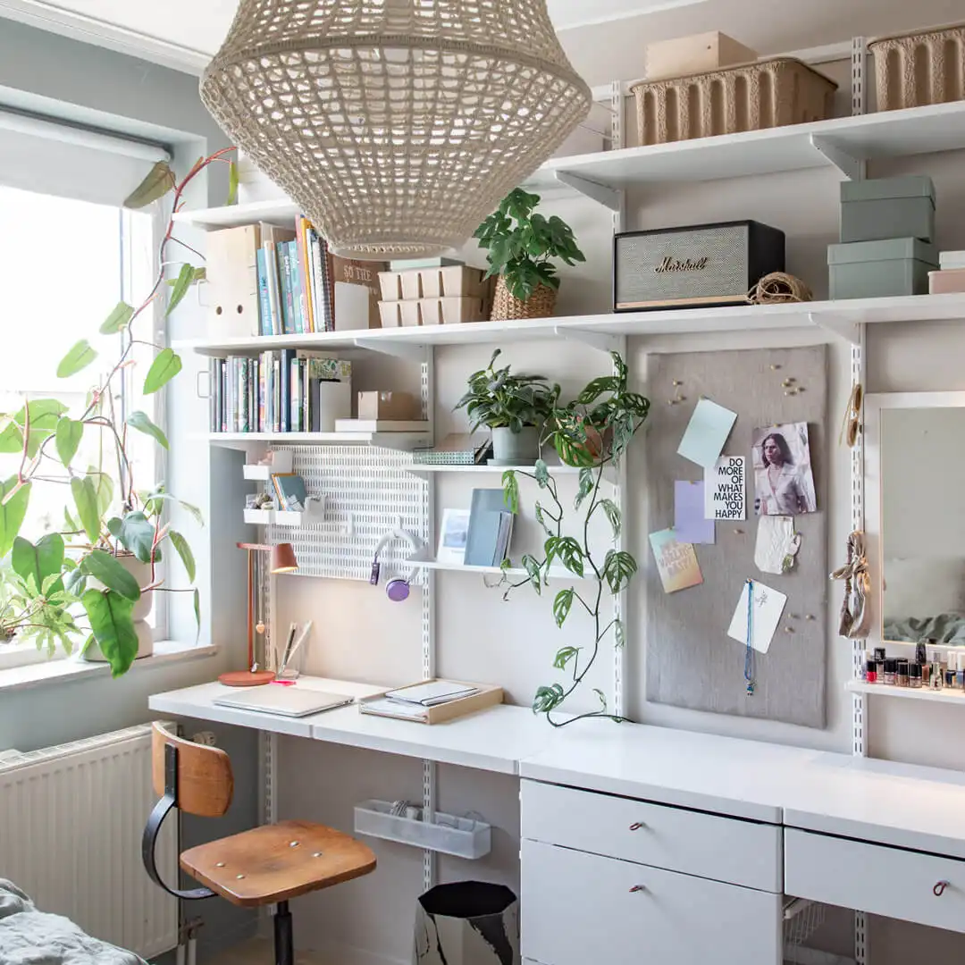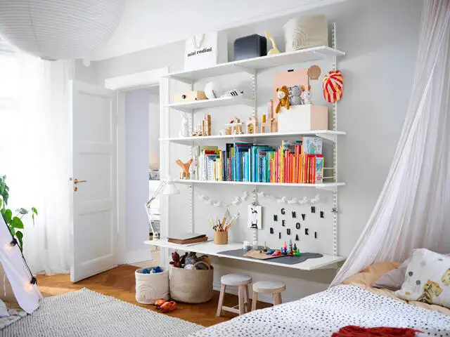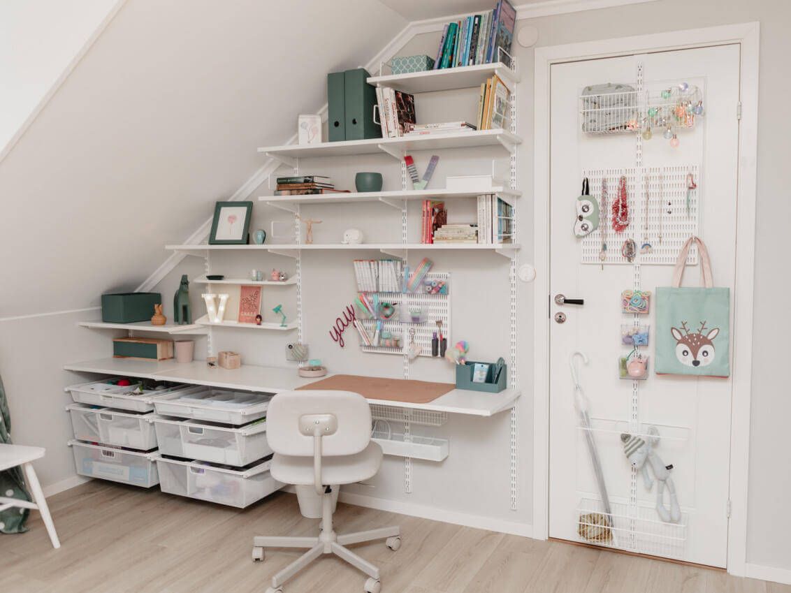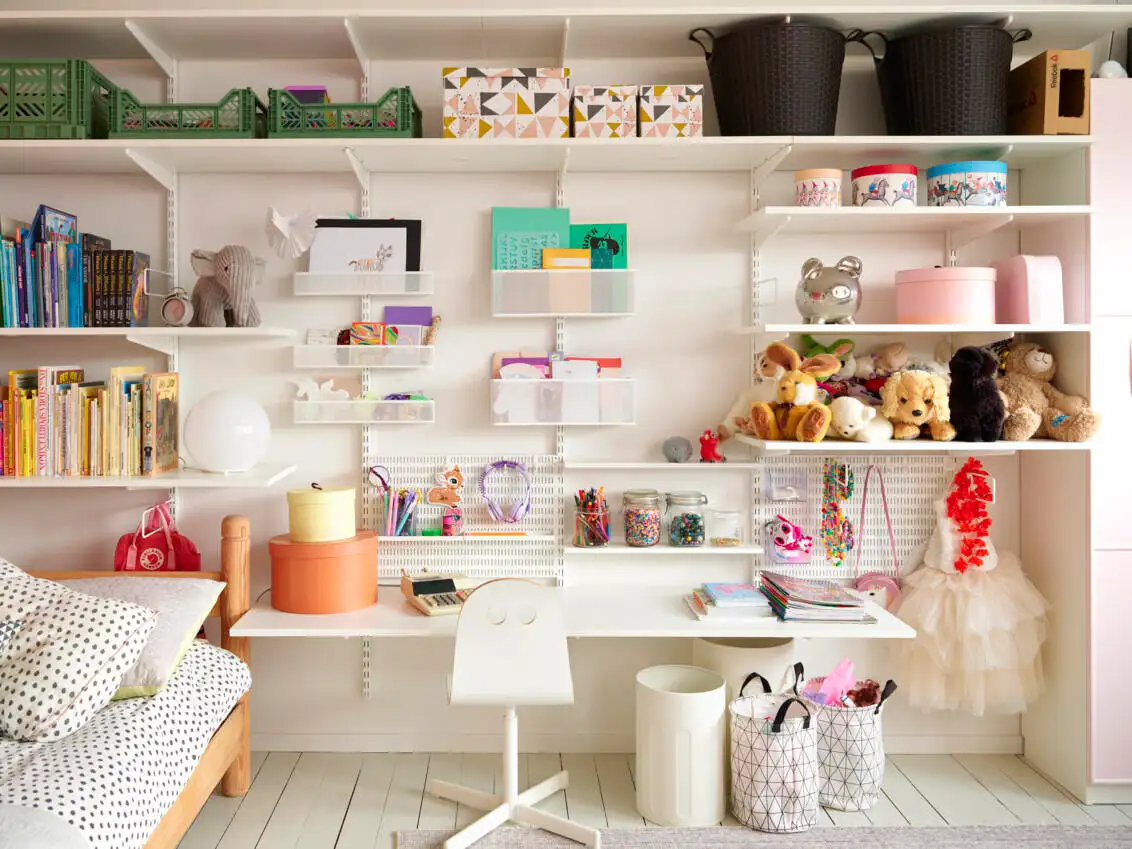 Soluția modulară Elfa pentru camera copiilor îmbină rafturi reglabile, organizatoare și sertare într-un sistem aerisit, montat pe perete. Configurațiile se ajustează pe înălțime și lățime și se rearanjează pe măsură ce copilul crește, astfel încât fiecare colț devine util: birou, lectură, hobby. Panourile perforate, tăvile, cutiile și barele țin la vedere cărți, rechizite și jucării, iar materialele durabile cu finisaje neutre se integrează ușor. Montanții și consolele asigură stabilitate, eliberează podeaua și simplifică întreținerea.