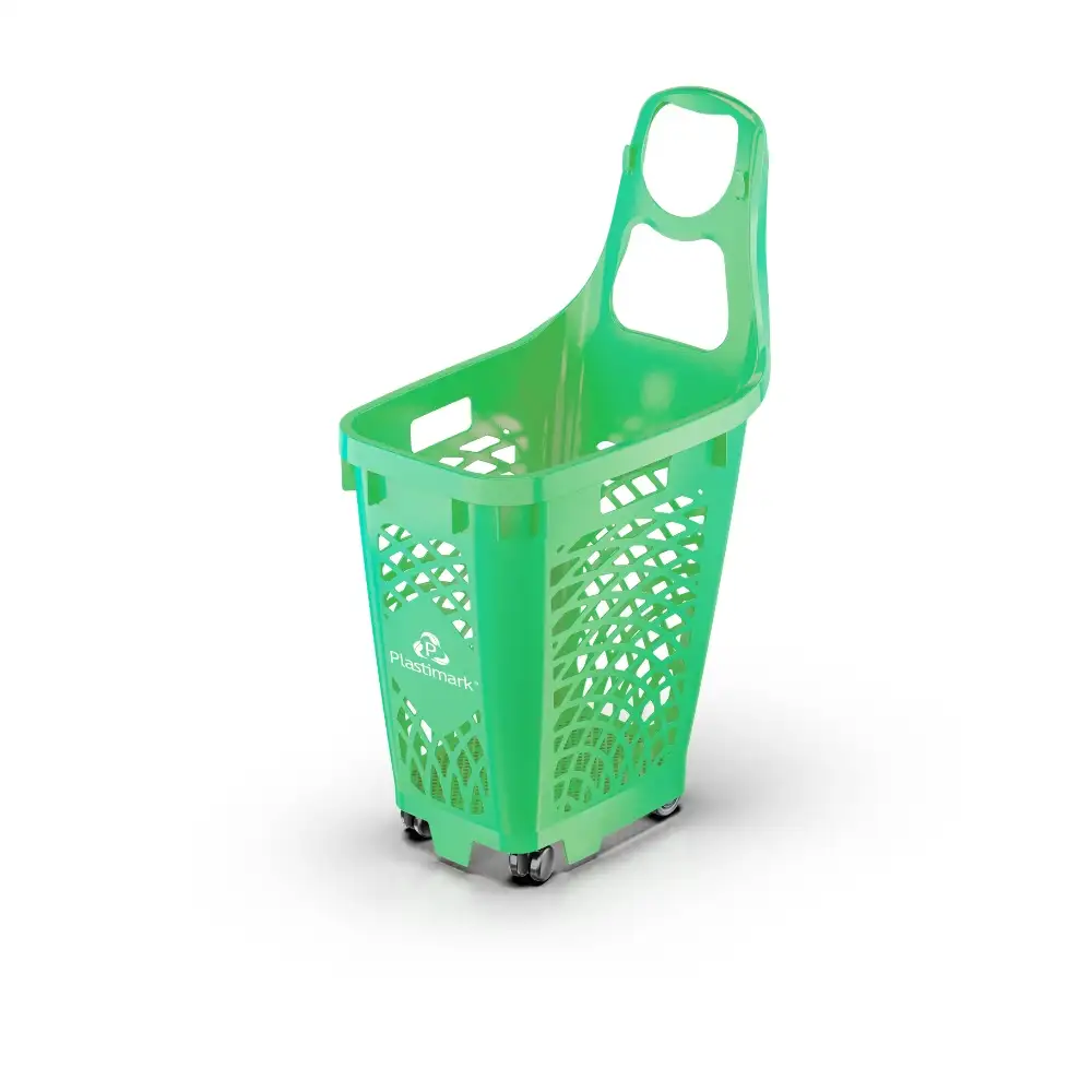 Cărucior din plastic SLIMMER cu 2 roți, 60 L, disponibil în culori verde și portocaliu, este conceput pentru transportul eficient al produselor în magazine, supermarketuri și spații comerciale.