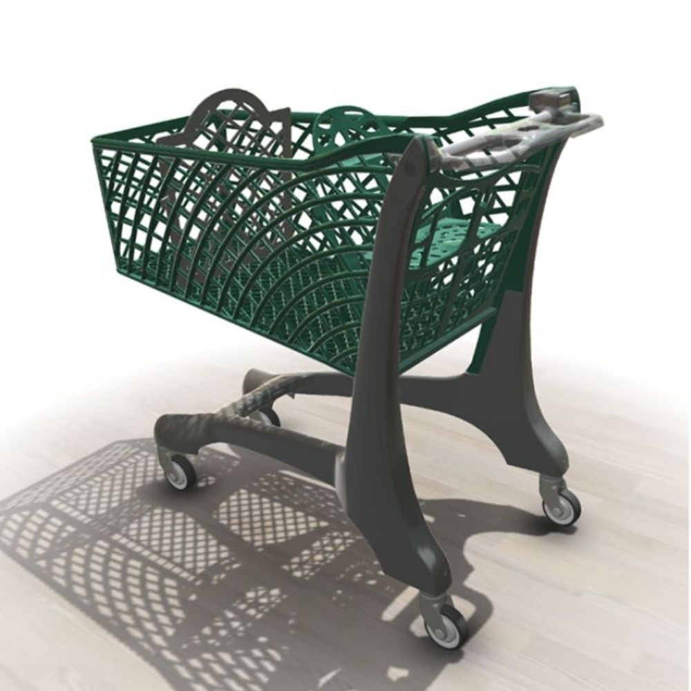 Cărucior din plastic TWIGA 150 L, disponibil în variantele gri închis cu perete-spate gri și gri cu corp verde, este proiectat pentru supermarketuri și magazine de dimensiuni medii.
