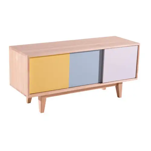 Comodă din lemn cu uși glisante în culori variate, perfectă pentru living, birou sau hol.
