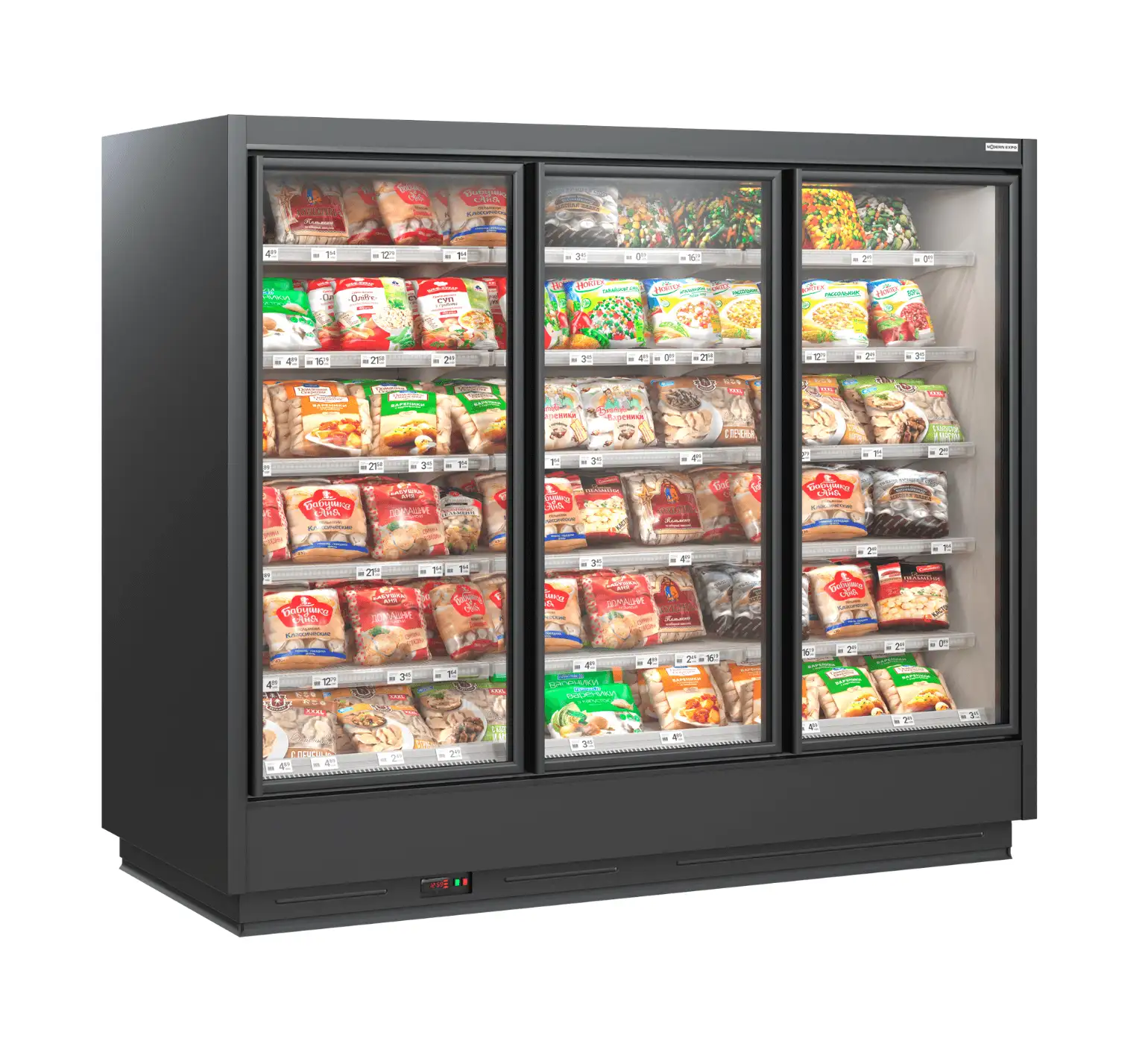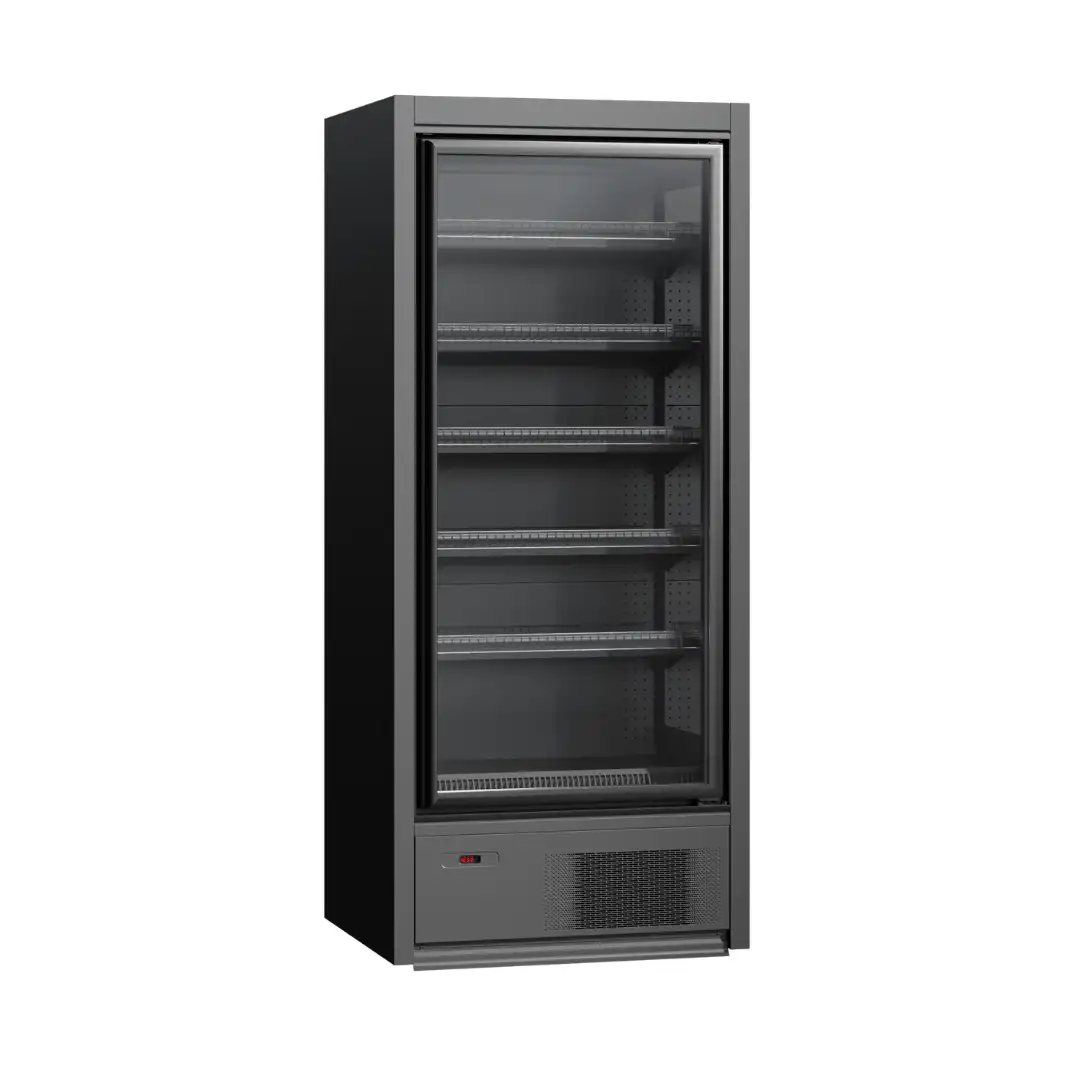 Congelator vertical cu temperatură scăzută și sistem de răcire la distanță. Echipamentul include controler de temperatură, ventilatoare eficiente energetic EC, supapă de expansiune, iluminare superioară LED și rafturi reglabile pe înălțime cu suporturi pentru etichete de preț. Ideal pentru afaceri.