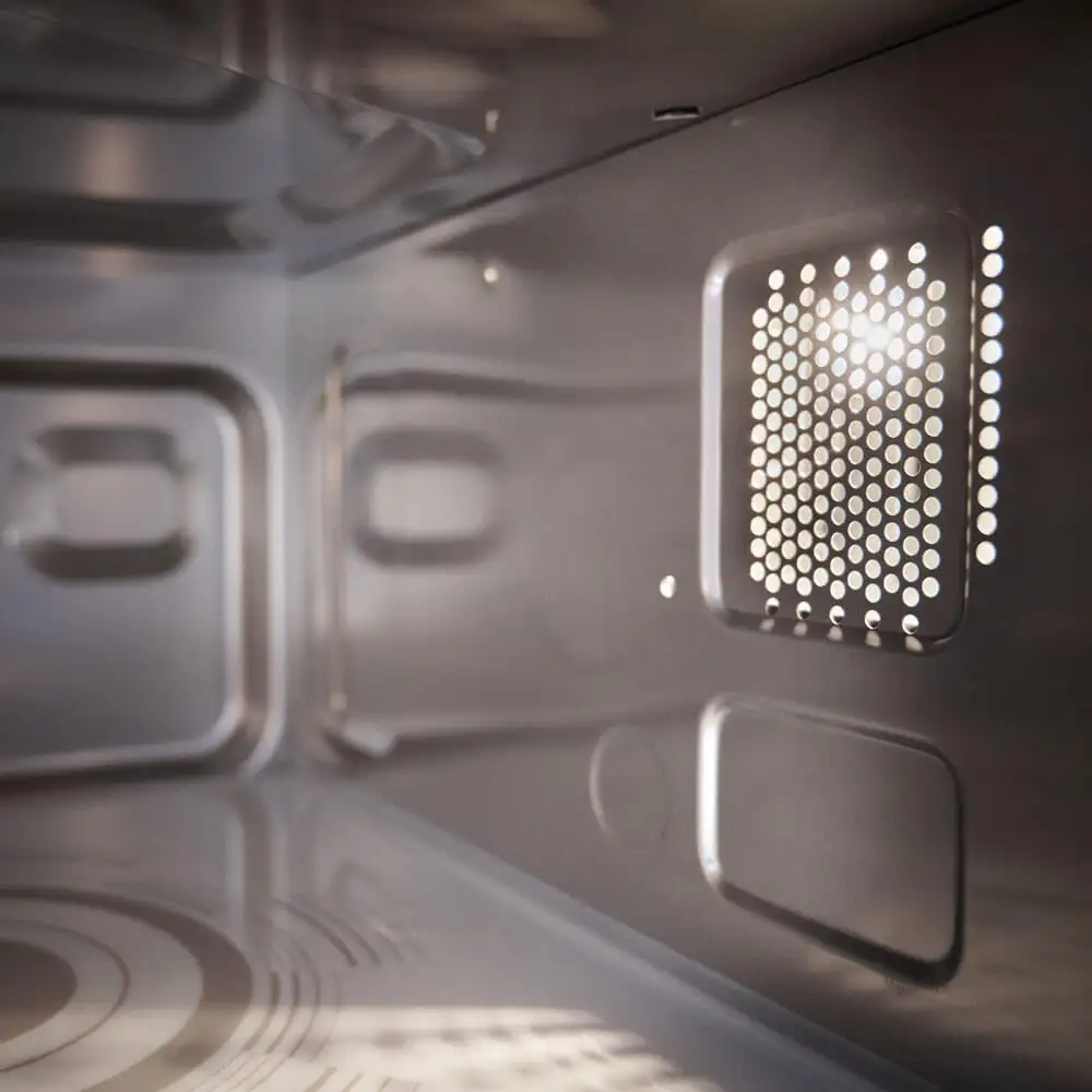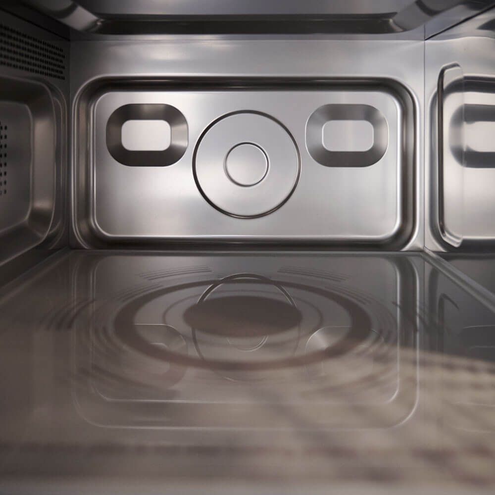 Cuptor cu control electronic, 3 nivele de putere și capacitate de stocare a 20 de programe în 3 trepte. Interval de ceas: 1 oră și 40 minute, posibilitate de dezghețare. Fabricat din inox, cu capacitatea camerei de 25 litri. Dimensiuni interioare: 335x364x212 mm. Putere microunde: 1000 W.