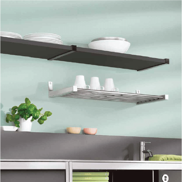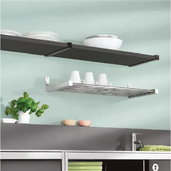 Sistem modular de rafturi de bucătărie montat pe perete, cu mai multe niveluri și coșuri de sârmă rezistente, ideal pentru organizarea alimentelor, accesoriilor și recipientelor. Designul vertical economisește spațiu și permite acces rapid la produse frecvent folosite, contribuind la o bucătărie ordonată și eficientă.