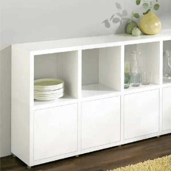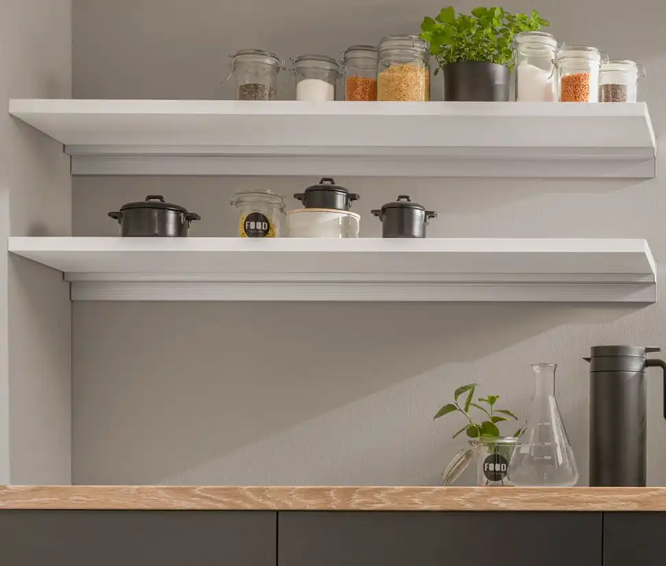 Dulapul de bucătărie de culoare albă cu design minimalist, rafturi deschise și compartimente închise în partea inferioară, oferiă spațiu generos pentru depozitarea elegantă a vaselor, paharelor și altor obiecte de uz zilnic. Se integrează perfect într-o bucătărie modernă, maximizând organizarea fără a încărca vizual spațiul.